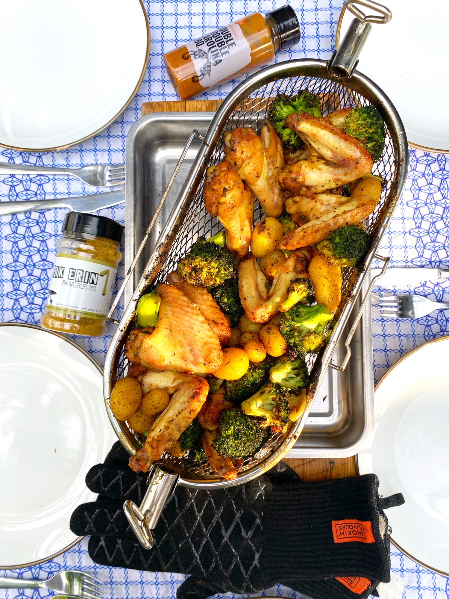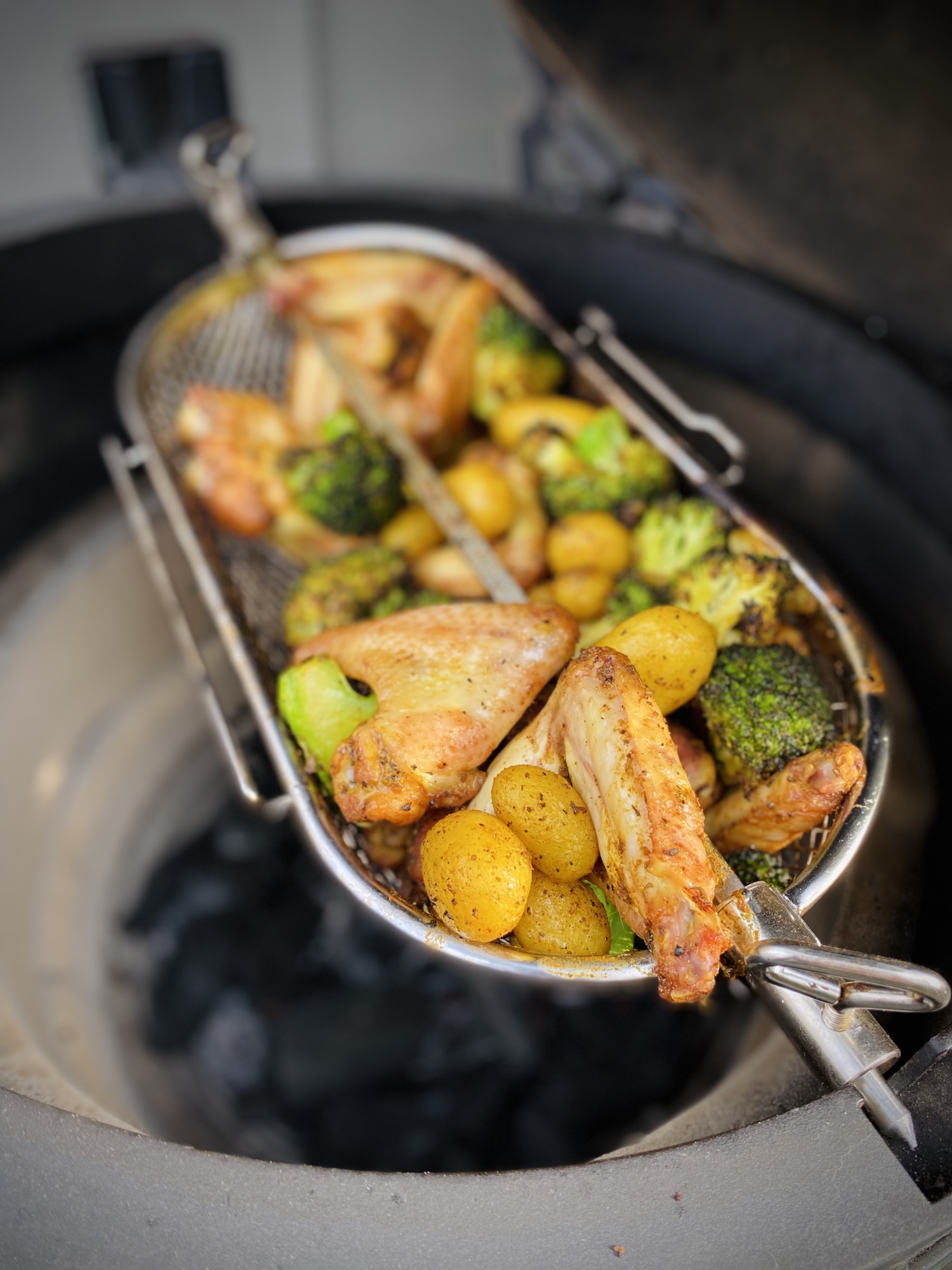Pak de ene helft van grillmand, steek hier het spit doorheen en zet deze vast met de vleugelmoeren. Vul de mand met de kippenvleugels, krieltjes en broccoli. Sluit de mand met het andere deel. Plaats de spit met grillmand in de spitring en zet de motor aan. Op het moment dat de mand begint te draaien sluit je het deksel van de barbecue.