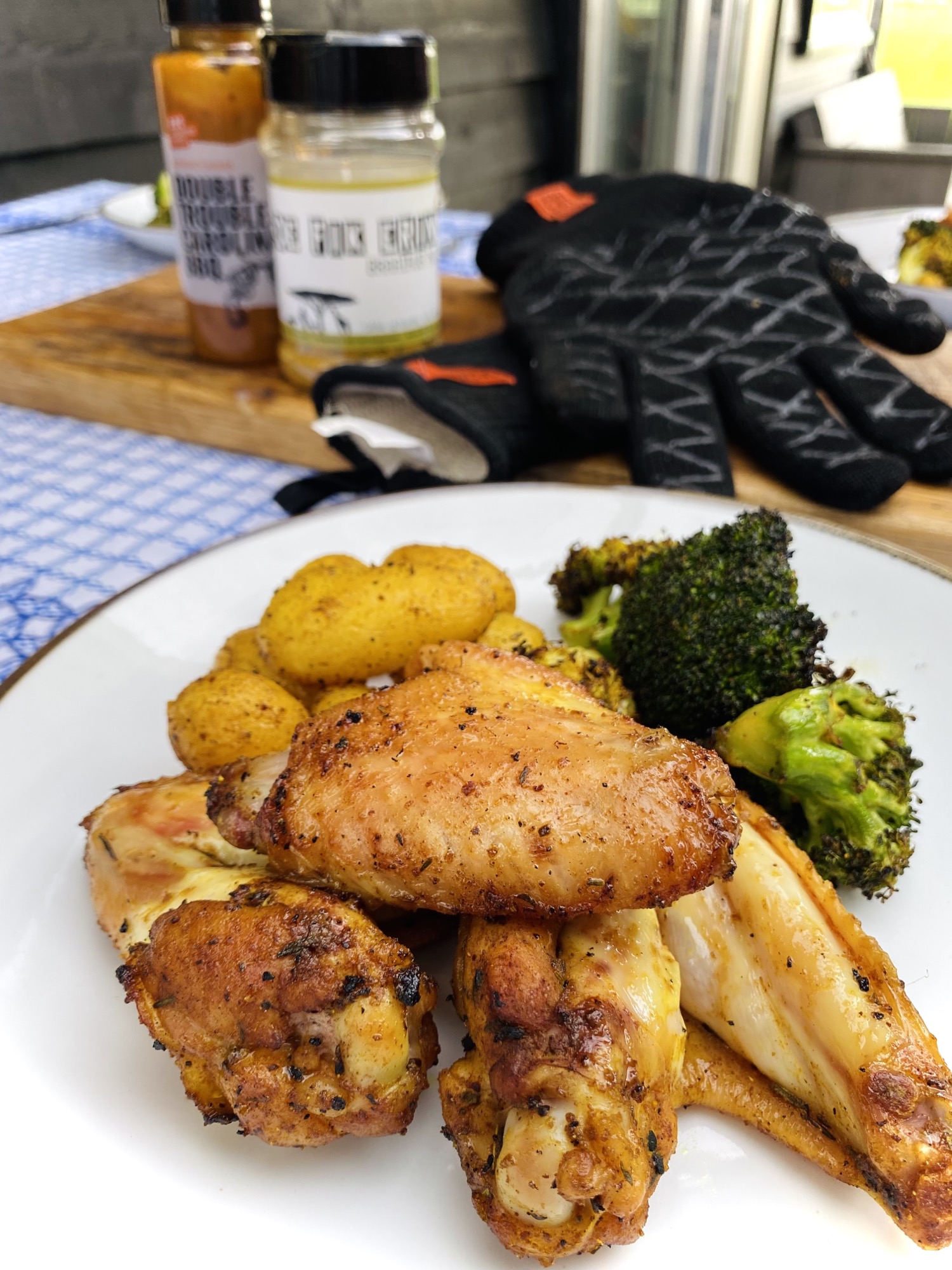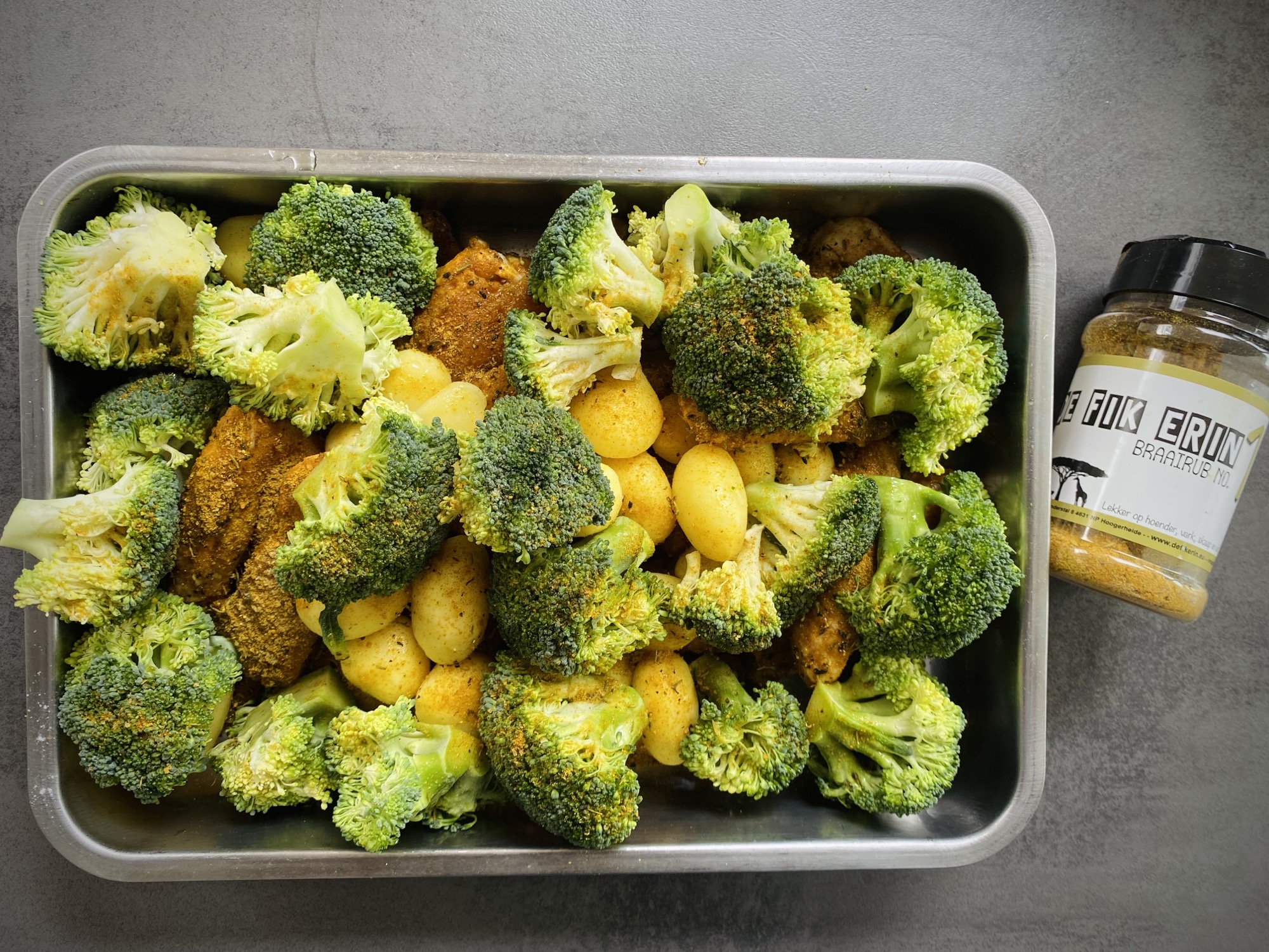 Snij mooie kleine roosje van de brocolli en snij grote roosjes in tweeën. Doe de kippenvleugels is een grote braadslede of schaal samen met de krieltjes en de broccoli roosjes. Knijp er het sap van 2 citroenen over. Besprenkel daarna het geheel met wat olijfolie. De citroen en de olijfolie zal straks helpen met een goede hechting van de rub. Teveel olie zal zorgen voor meer vlammen en dus een ongelijkmatige garing, dus wees hier voorzichtig mee. Strooi er defikerin nr 1 over en meng de ingrediënten goed door zodat de rub rondom goed hecht. Strooi zonodig nog wat extra van de gele rub er over.