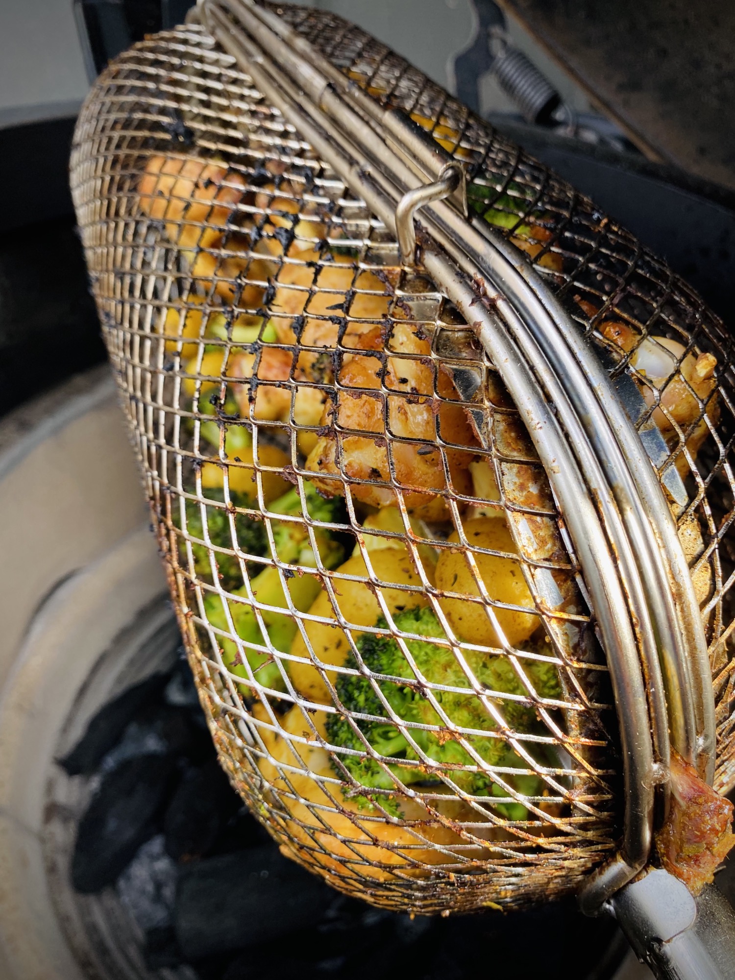 Als je het spit uitbreid met een grillmand dan kun je er nog veel meer kanten mee op. En deze Aardappelen, Groente, Vlees ofwel “A.G.V. van het spit” is er eentje van. Het mooie van dit gerecht is dat alles gelijkertijd in de korf kan en het geheel gelijkertijd klaar is. Het is bij een soortgelijke bereiding van belang dat de ingrediënten dezelfde garing nodig hebben. Dit kun je bereiken door ingrediënten te gebruiken met ongeveer dezelfde gaartijd. Paprika zal veel eerder te zacht worden ten overstaande van een stevige aardappel. Door de groentes kleiner te snijden en door sommige van te voren voor te koken kom je ook al een eind. Daarnaast is het ook een kwestie van proberen .