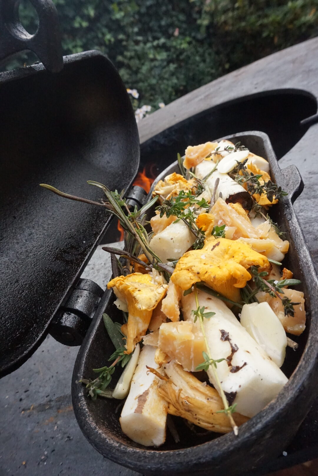 Sluit het gietijzer en plaats deze in of vlak boven het vuur. Binnen 15-20 minuutjes zal de schorseneer gaar zijn. Serveer het gerecht met een mooi stuk wild vlees of geniet ervan met een donker biertje.