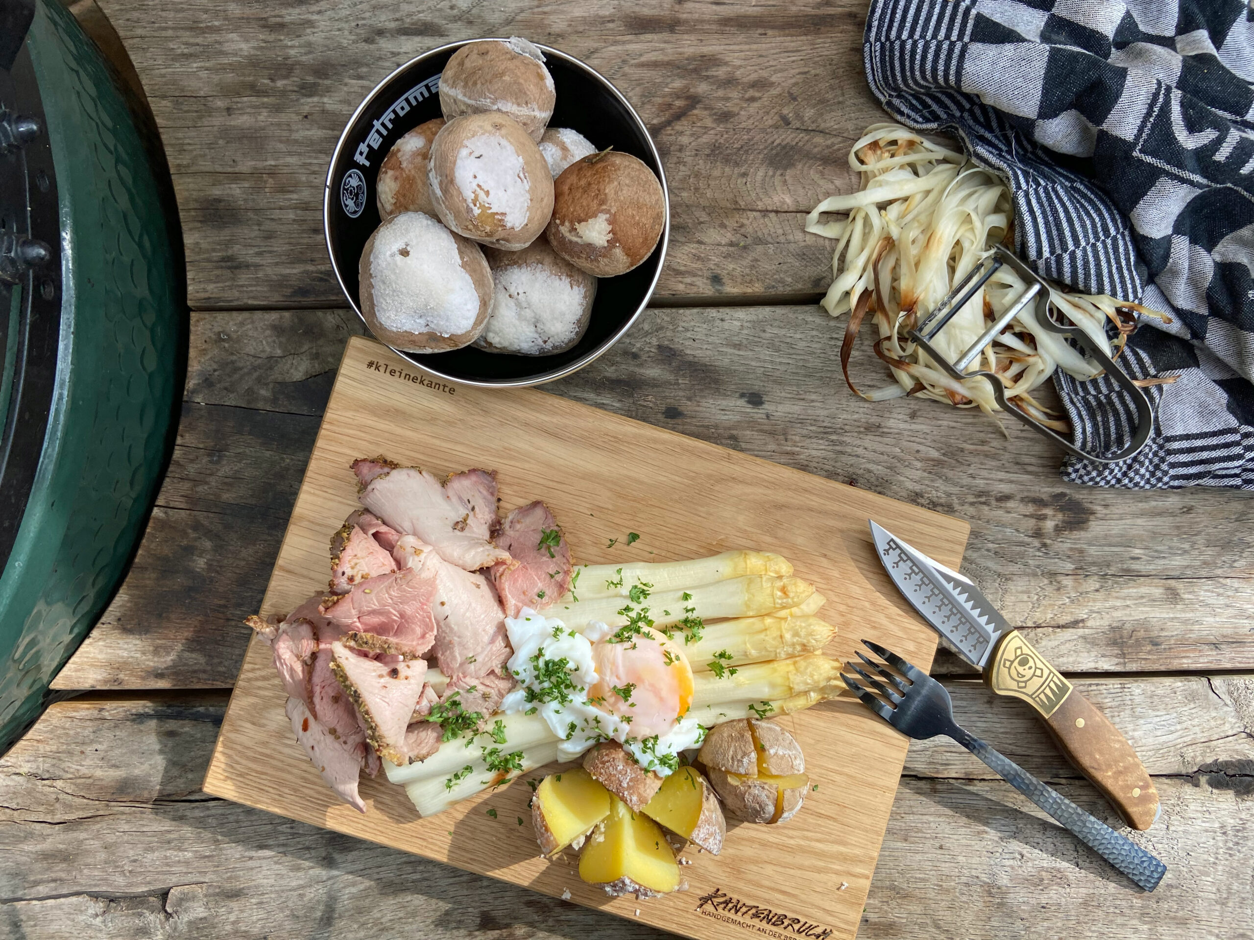 Neem alle ingrediënten van de barbecue. Leg eerst de asperges op het bord, snij dunne plakken van de procureur en leg deze over het einde van de asperges. Zet een kruis in de aardappels leg deze bij het bord erbij. Leg het gepocheerde eitje erop. Snij nu de verse krulpeterselie fijn en strooi er overheen. Eet smakelijk!