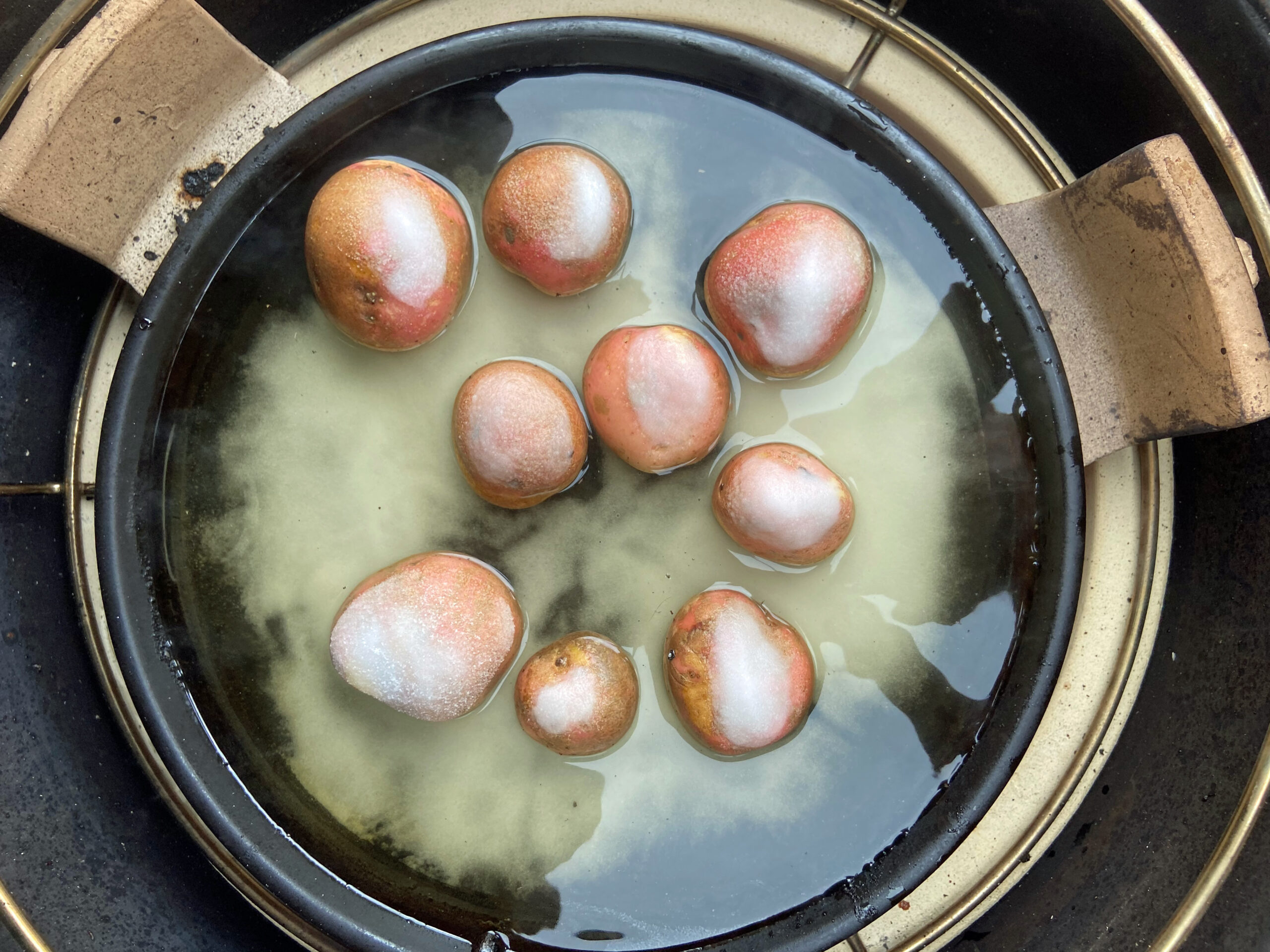 Boen de (bildtstar) aardappels schoon wanneer hier nog veel zand aan zit. Leg deze in de druippan en voeg hier 1 liter warm water aan toe. Zorg dus dat je druippan groot genoeg is om 1 liter water aan te kunnen. Strooi nu royaal het zout over de aardappels en in het water. Laat de druippan nu eerst warm worden voordat je deze direct op je plate setter zet. Dit ivm knappen van je hitteschild.