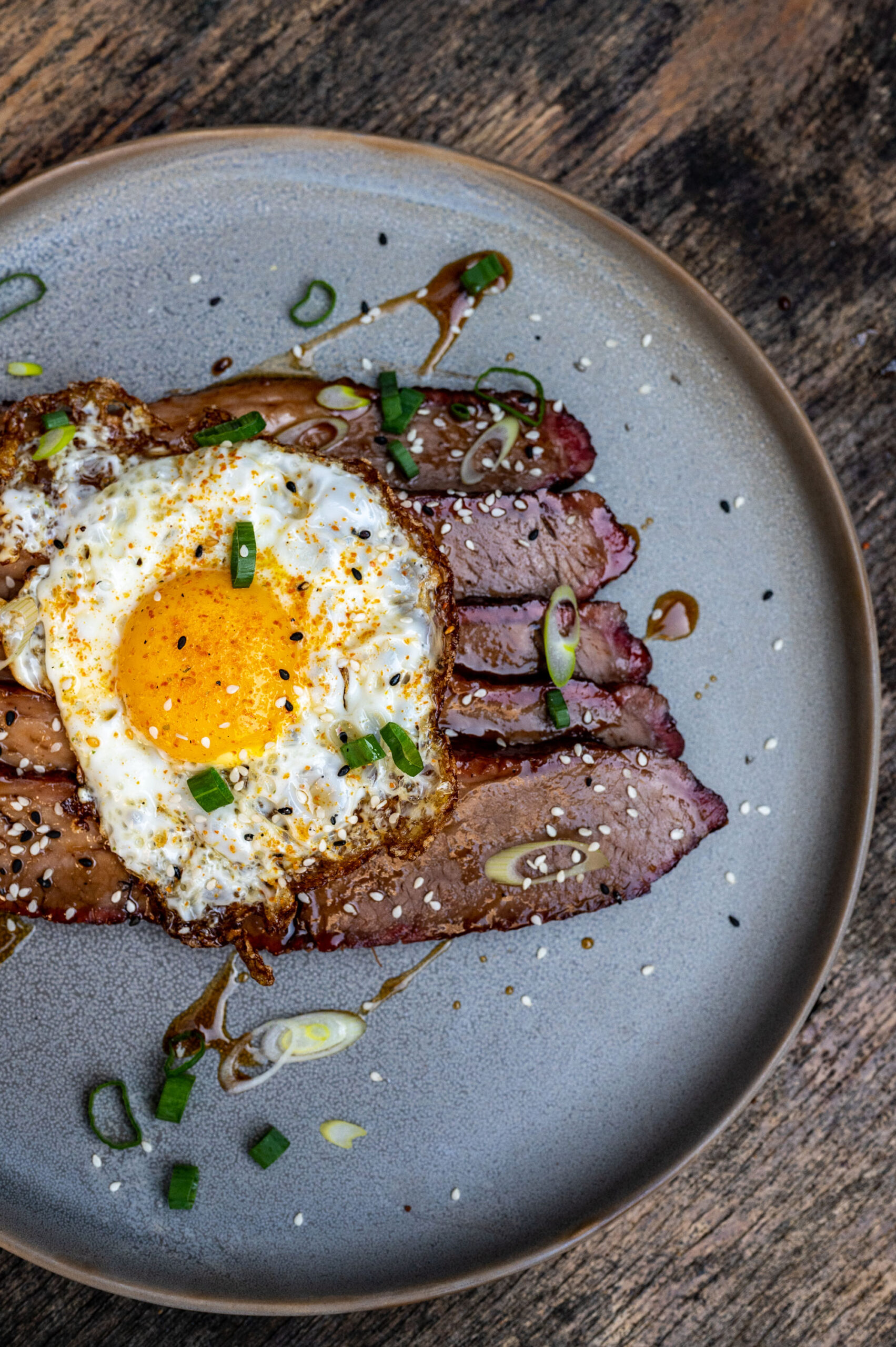 Snij dunne plakken brisket op een bord. Bak intussen een sunny side up eitje. Besmeer de plakken met een lik Black Mojo en leg het eitje op het vlees.. Garneer met sesam en fijngesneden bosui en een flinke draai uit de pepermolen. Beter kan je zondag niet beginnen!