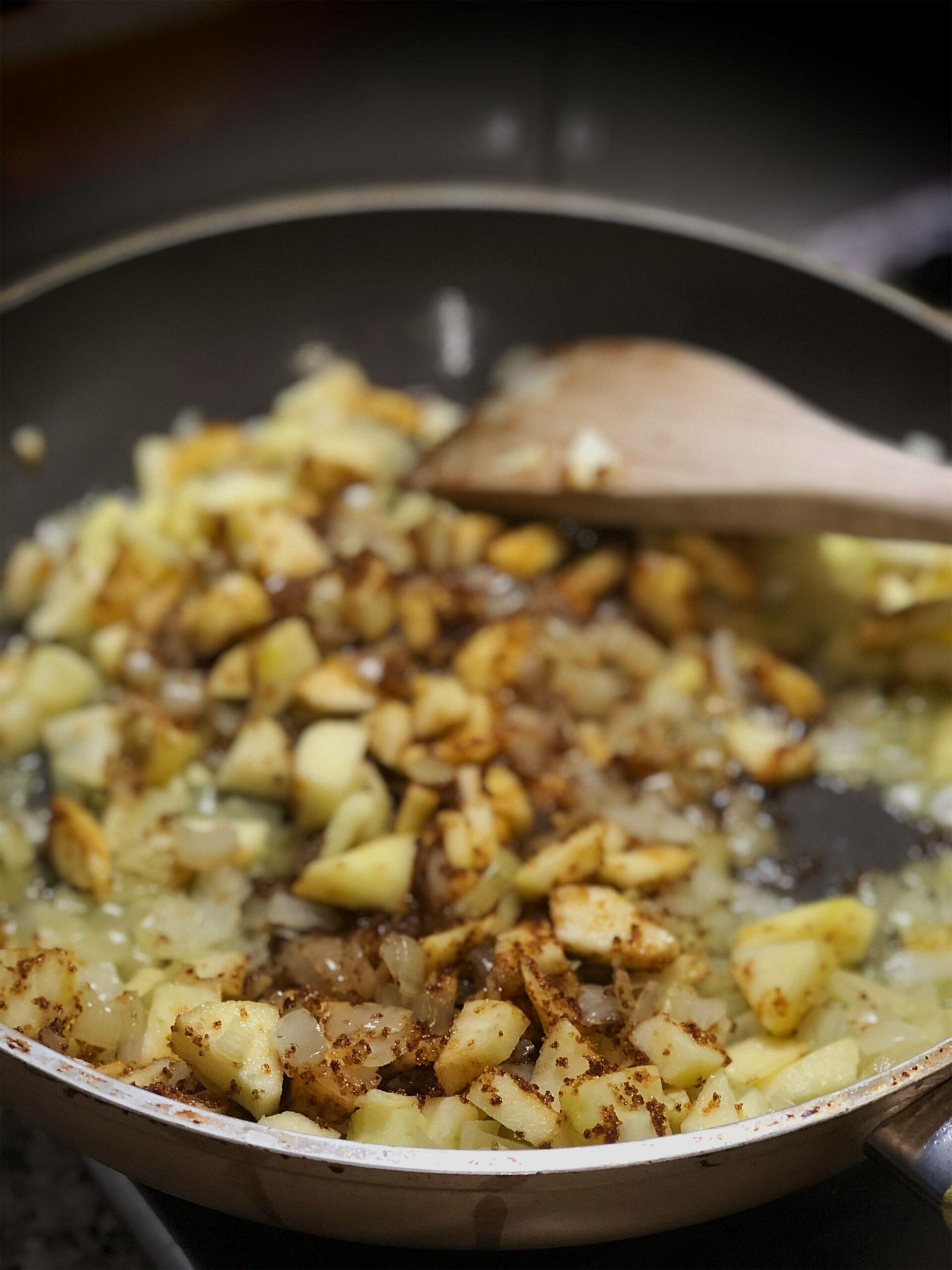 Snipper de uien en snij een grote jonagold in blokjes van een centimeter. Doe een scheut olie in de pan zodat de hele bodem bedekt is. De ui gaan we op half vuur als eerst aanfruiten, totdat deze mooi glanst.
