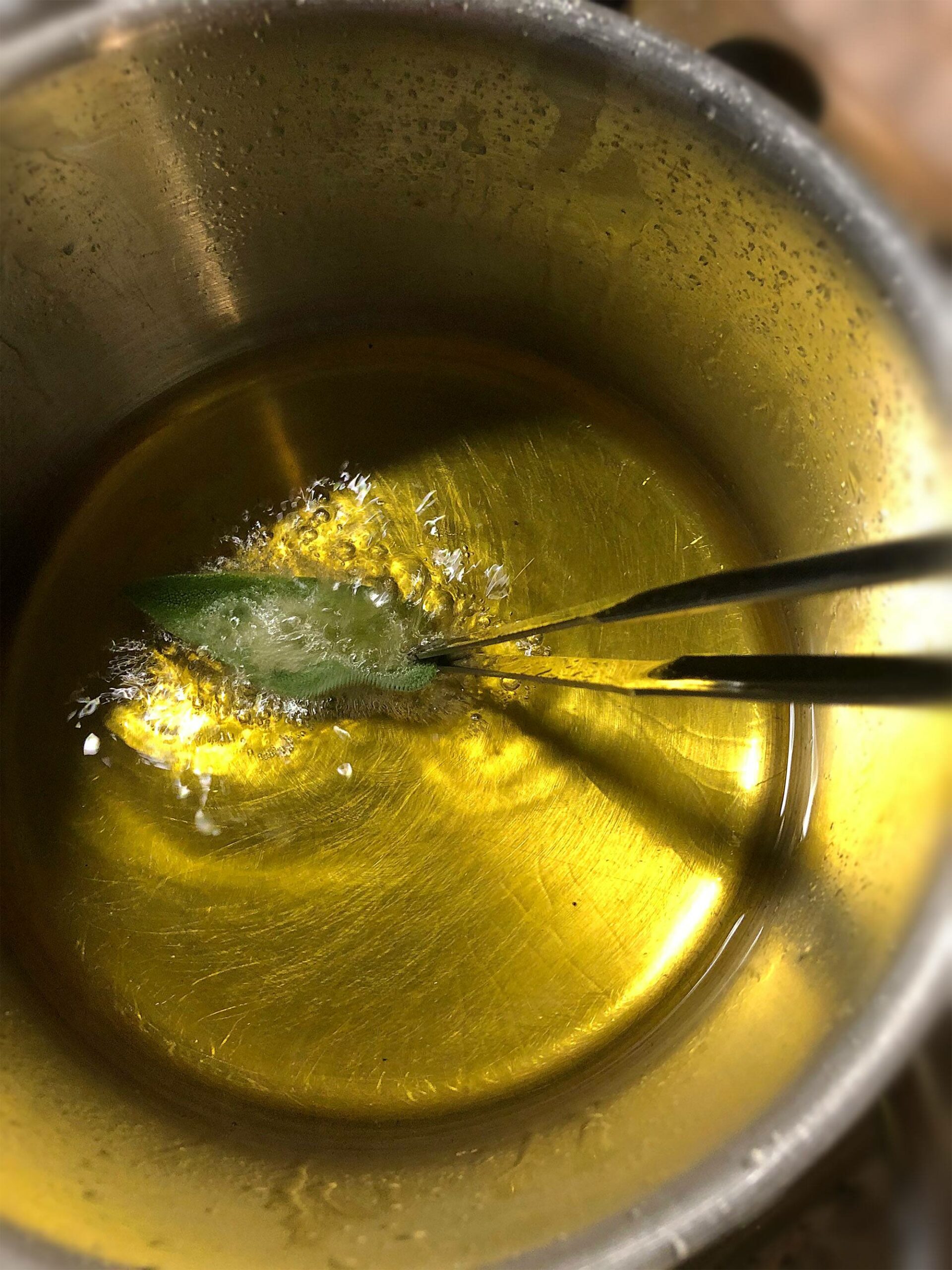 Voor een extra krokant effect in het broodje gaan we de salie frituren. In een klein pannetje doen we een laag van 4-5 centimeter rijstolie. Het voordeel van deze olie is dat het niet verbrand bij hogere temperaturen verhitten. Terwijl de olie opwarmt plukken we enkele blaadjes salie. Voor het frituren van de salie gebruiken we een grote pincet of barbecuetang. Pak één blaadje en hou deze voor zo’n drie seconden in de olie. Het blaadje zal een tint groen veranderen maar mag zeker niet bruin worden. Leg ze daarna op wat keukenpapier om uit te lekken.