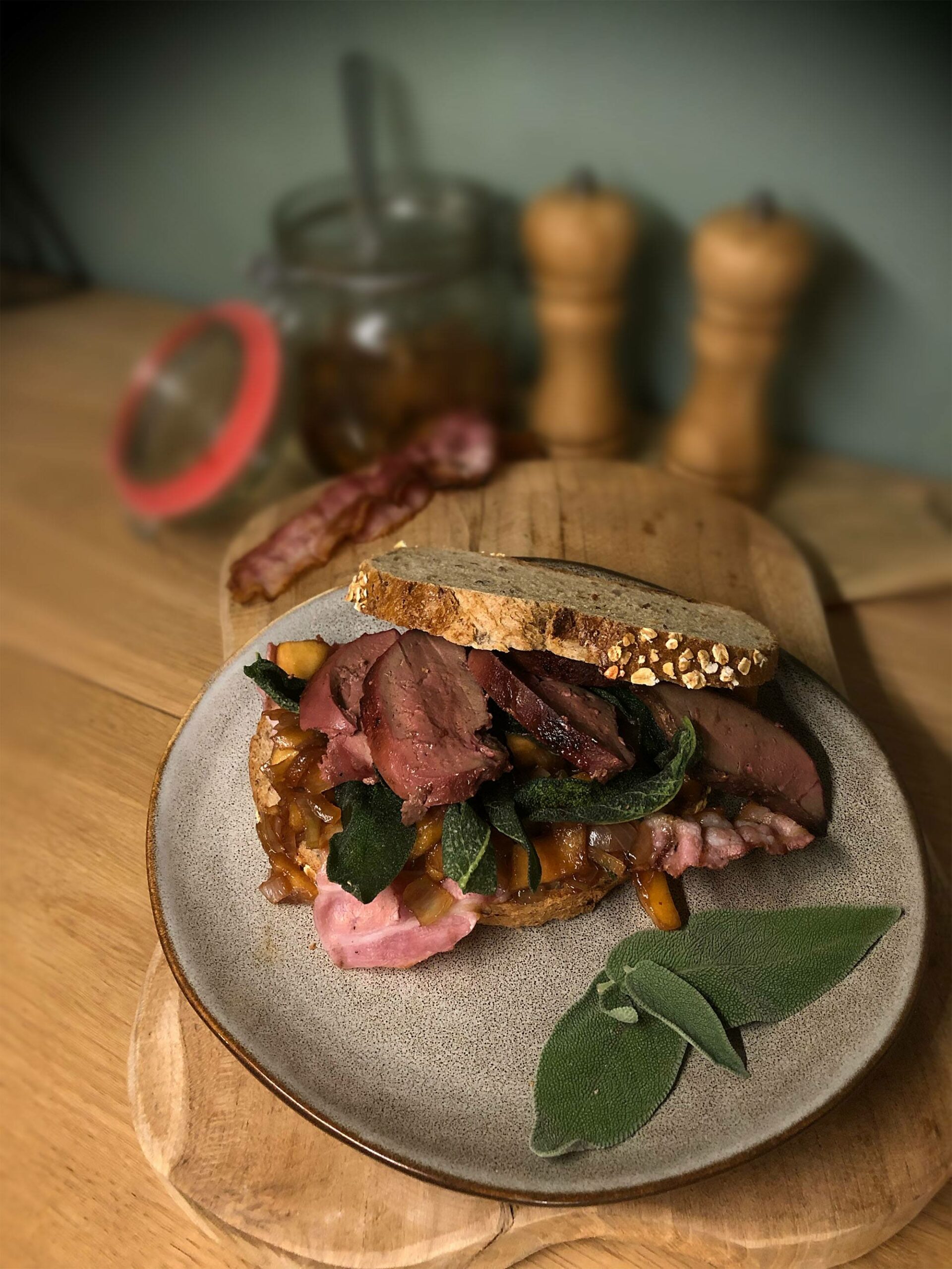 Nu is het nog een kwestie van je broodje bouwen. Snij dikke boterhammen van je favoriete brood. Leg op de onderste boterham 2-3 stukken krokante spek. Schep hier de uiencompote over en leg er de salie op. Trancheer de lever in kleinere stukken zodat deze beter zijn te verdelen op het brood. Dek het geheel af met een tweede dikke boterham. Eet smakelijk!