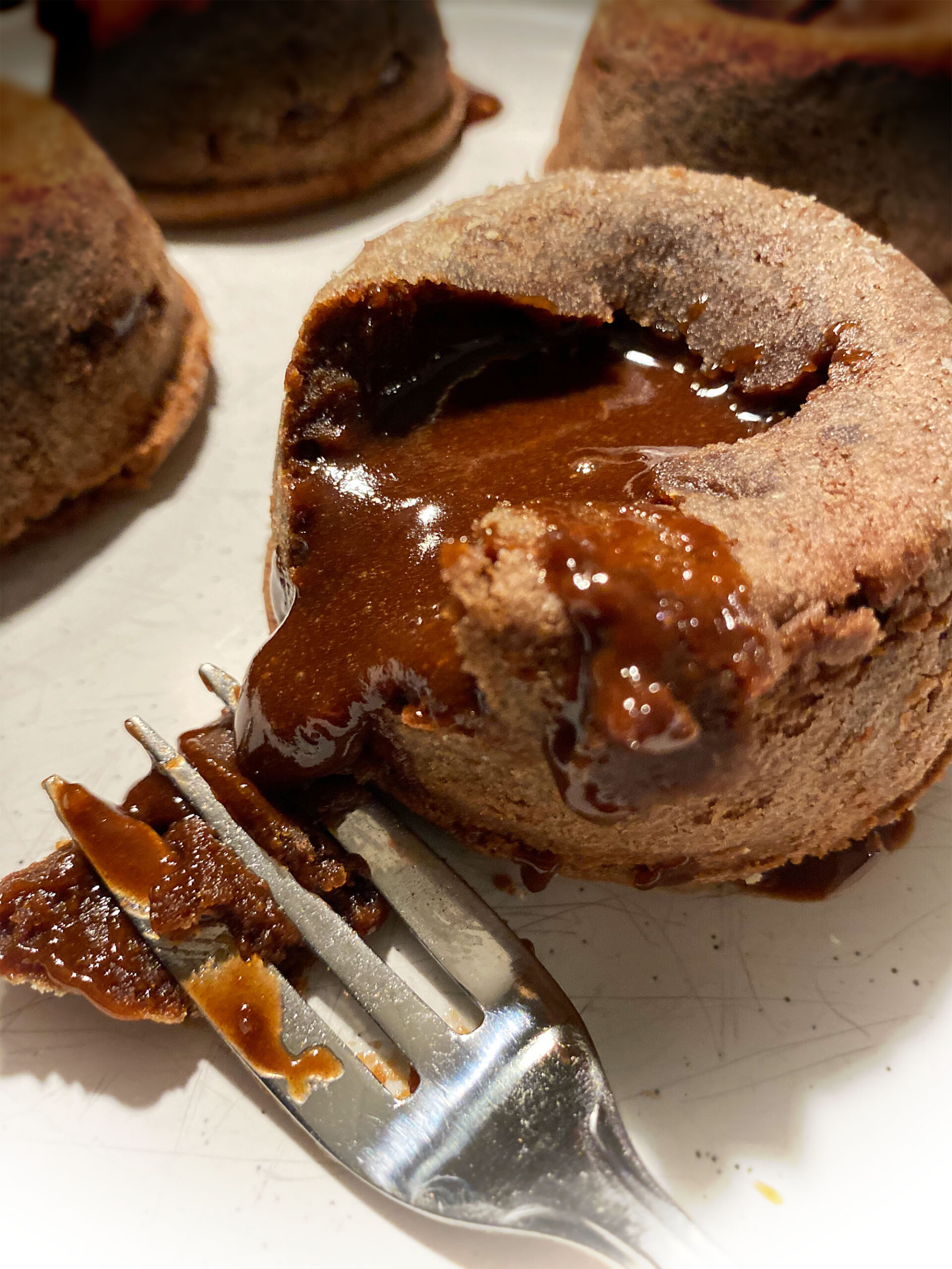 Bak de moelleux 8 tot 10 minuten op het RVS rooster van je EGG. Check ze deze laatste minuten enkele malen. Je wil ze niet te vroeg er af halen zodat ze volledig instorten en ook niet te laat want dan worden het chocolate muffins. De buitenrand zal ruim een centimeter goed gaar moeten zijn. Hou er echter wel rekening mee dat het deeg wat steviger wordt als het enige tijd van het vuur af is.