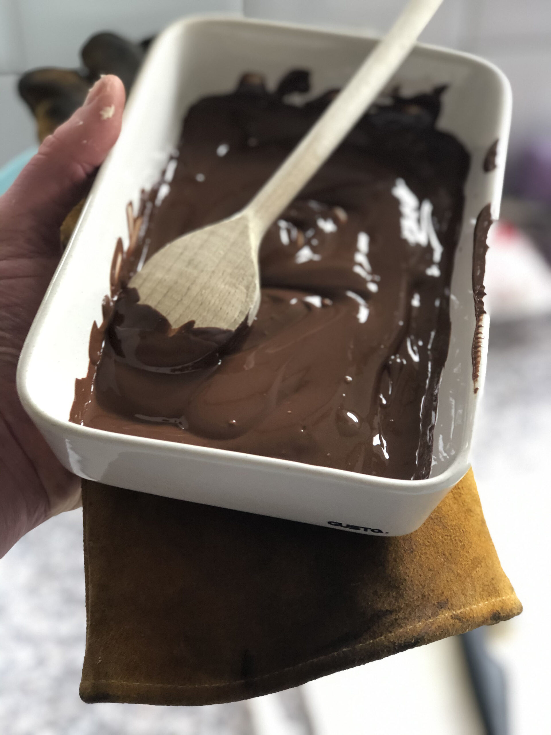 Doe ondertussen de chocolade en boter in een ovenschaal. Als de houtskool voldoende gloeit plaatsen we de convEGGtor met RVS rooster. Zet de ovenschaal direct op het rooster, sluit de EGG met onder en boven nog volledig open. Terwijl de EGG langzaam opwarmt naar de 200 graden Celsius, gebruiken we de warmte in het begin om de chocolade te laten smelten. Als de chocolade enigszins is gesmolten dan halen we de schaal van de egg en roeren de chocolade met de boter.