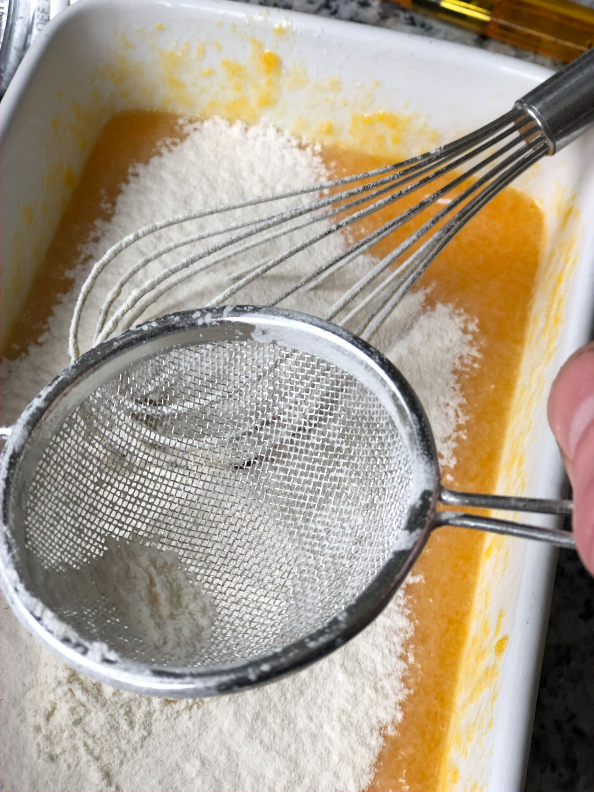 In een tweede schaal doen we de suiker, twee eieren en twee dooiers van eieren. Meng dit met een garde goed los. Zeef er dan de bloem bij en klop het dan tot een egaal beslag. Dit beslag gaat vervolgens samen met de chocolade. Voeg een snufje zout toe en roer het chocolade beslag.