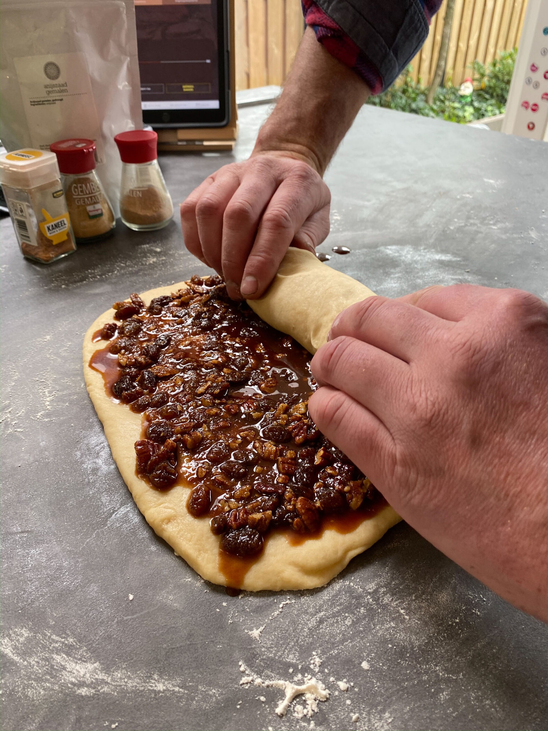 Rol het deeg via de lange zijde op. Snij de rol in 9 gelijke stukken en verdeel de cinnamon rolls in de bakvorm, door ze er rechtop in te zetten.