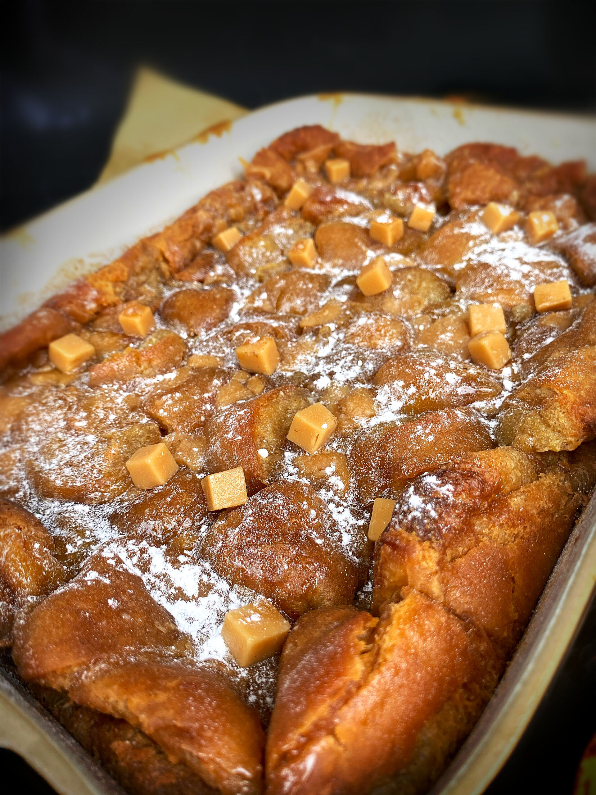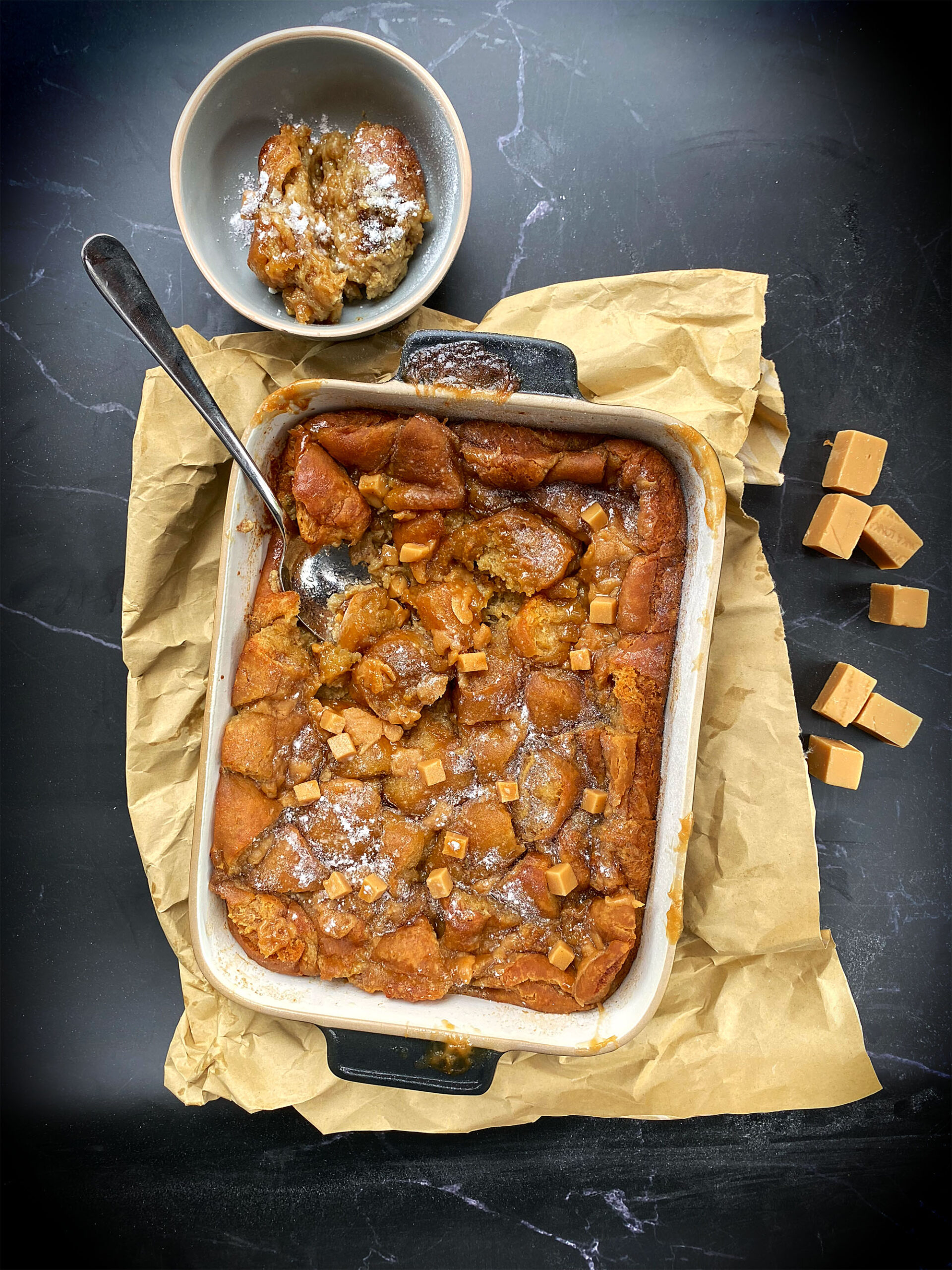 Snij de caramel tot kleine blokjes van ongeveer een halve centimeter. Na een kwartiertje strooien we blokjes over de donutpudding en laten hem dan nog eens een kwartier bakken.