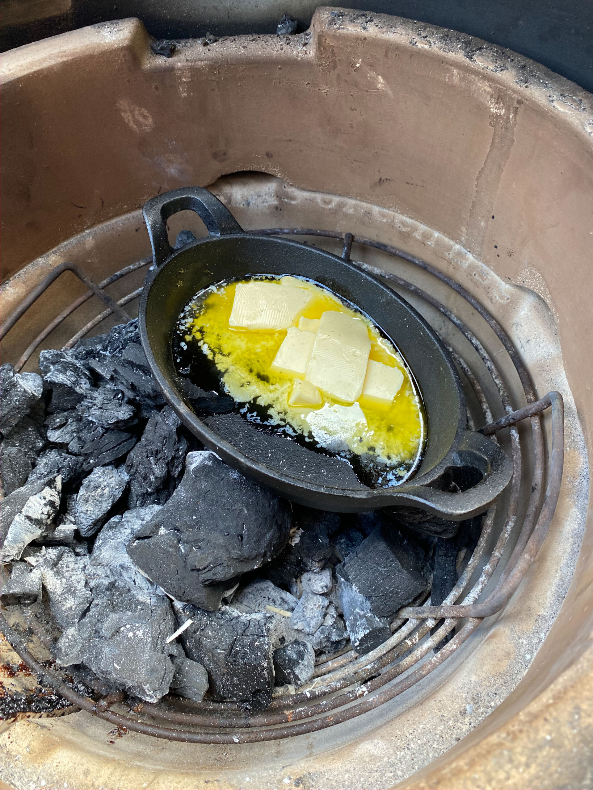 Omdat de boter geklaard moet worden heb ik er voor gekozen om een kleine skillet (met handschoenen aan) te plaatsen op de houtskool die al aardig begon te gloeien. Doe hierin de boter totdat deze mooi dun en geel is geworden. Uiteraard kan en mag dit ook in een pannetje op het gasfornuis. Kwast de ovenschaal in met een beetje van de boter.