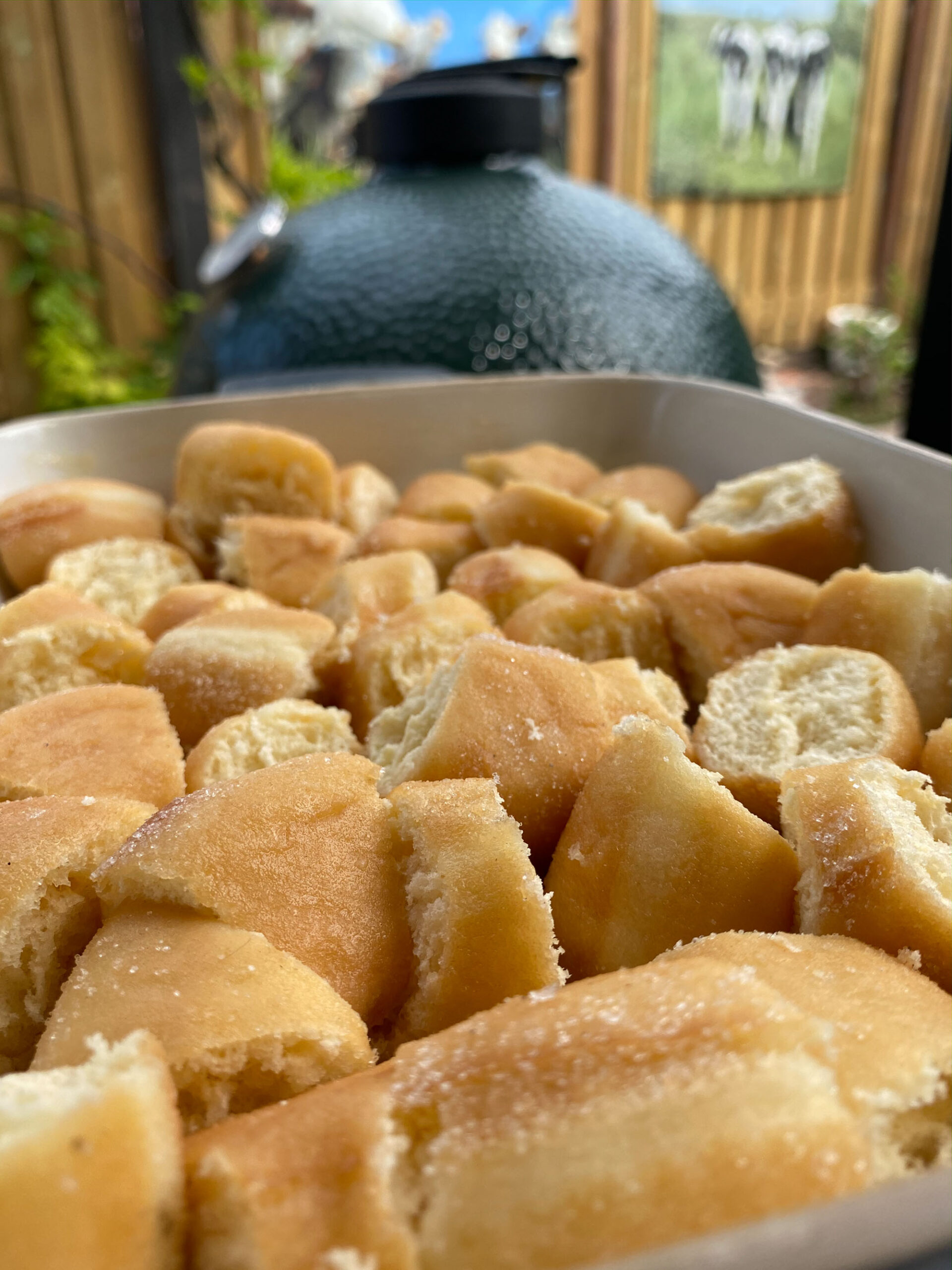 Maak je barbecue klaar van 180 graden Celsius indirecte bereiding. Terwijl de barbecue op temperatuur komt maken we de donut pudding klaar.