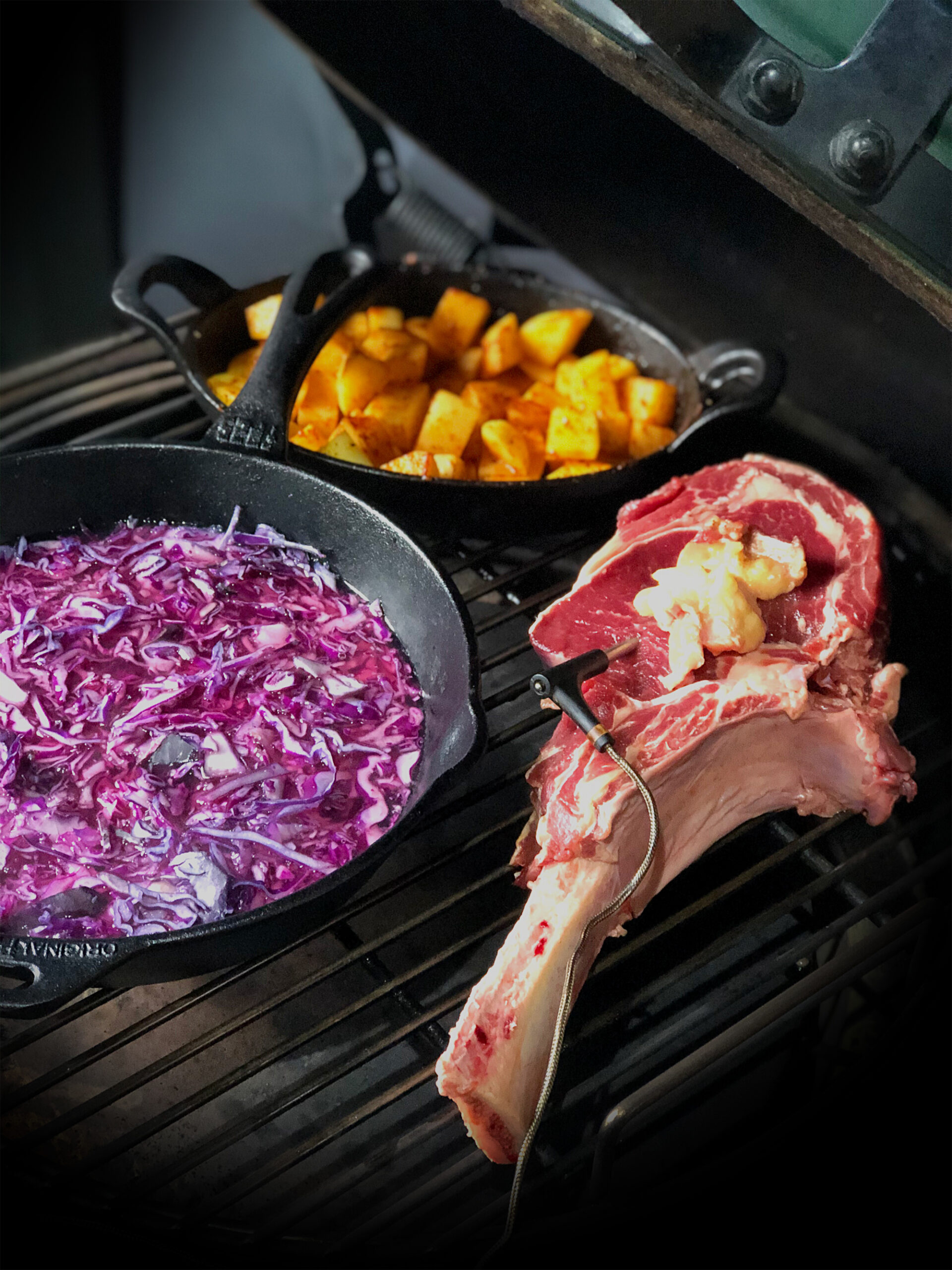 In de grotere tweede skillet doen we de rode kool met een scheut appelsap. De aardappel en rode kool hebben doorgaans even de tijd nodig om te garen. Als EGG inmiddels op temperatuur is, dan kunnen beide skillets op het rooster.