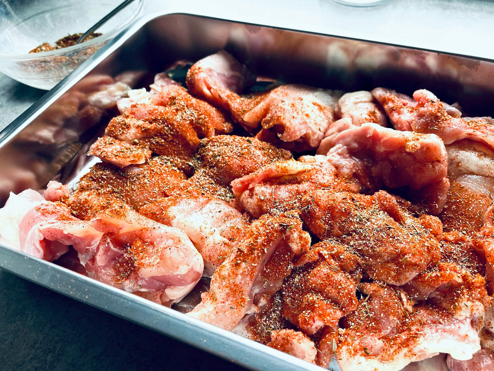 Doe de kipdijfilets in z’n geheel in een grote mengkom. Haal de filets een beetje los en van elkaar af. Strooi royaal de Griekse/Gyros rub over kip en meng even goed door. Druk de kip goed aan in de kom en dek strak af met vershoudfolie en laat minimaal 2 uur marineren.