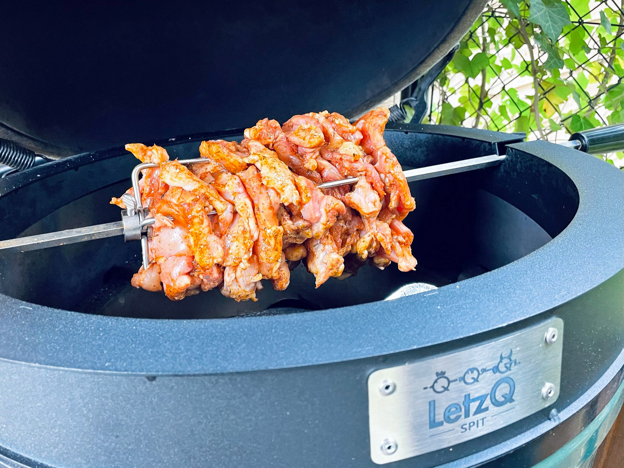 Haal de folie van je kip en rijg de kipdijfilets één voor één aan het spit. Zorg dat je het zwaarte punt ongeveer op het midden van je spit hebt zitten. Kipdijfilets hebben een dikke en een dunne kant. Rijg de filets daarom om en om met de dikke en de dunne kant steeds een kwart slag gedraaid. Zo zorg je voor een evenredige balans op je spit. Niet alleen beter voor een mooie gelijkmatige garing, maar ook het motortje van je spit zal je eeuwig dankbaar zijn!