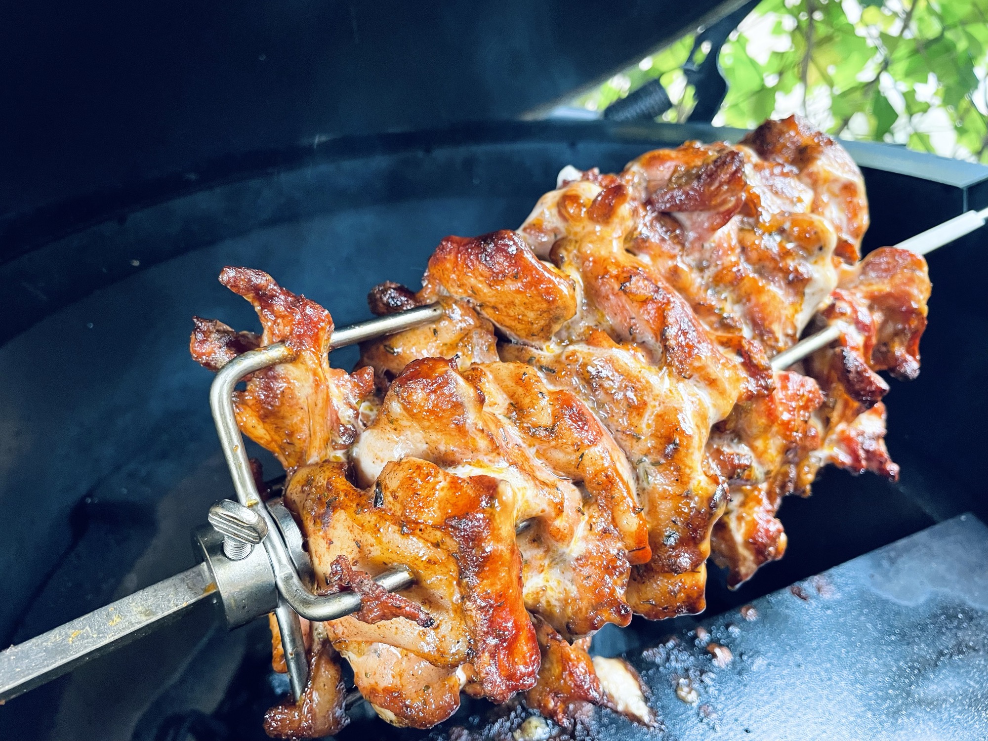 Plaats het spit op je barbecue. Zet het motortje aan en laat de kip zo’n 45 minuten ronddraaien boven het vuur. Controleer tussendoor of het niet te hard gaat. Wordt de buitenkant al erg donker? Snijd er dan gerust alvast een paar plakken af! Kip is (veilig) gaar van 72 oC. Controleer de kerntemperatuur met een thermometer.