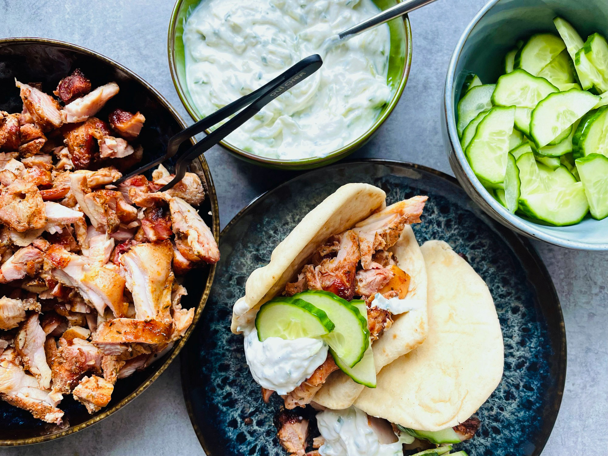 Bak de broodjes af volgens de verpakking óf bak ze lekker zelf volgens het recept uit de ingrediëntenlijst. Snijd 1 komkommer in dunne plakjes. Haal het spit met de gare kip van het spit en snijd er gyros van. Zo van het spit in de kom. Pro tip! Doe dit aan tafel voor een stukje show.