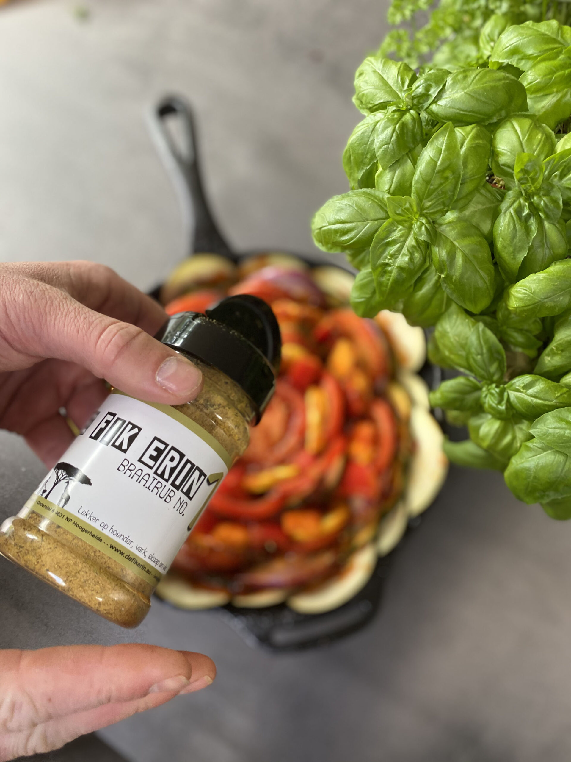 De openingen tussen de groentes smeren we in met de General TSO BBQ saus. Dit geeft extra smaak en zorgt dat de kruidenrub no. 1 van De Fik Erin, die we hierna aanbrengen, goed hecht. De rub zorgt ook voor een heerlijke smaakkick en dat het geheel natuurlijk niet te flauw wordt.