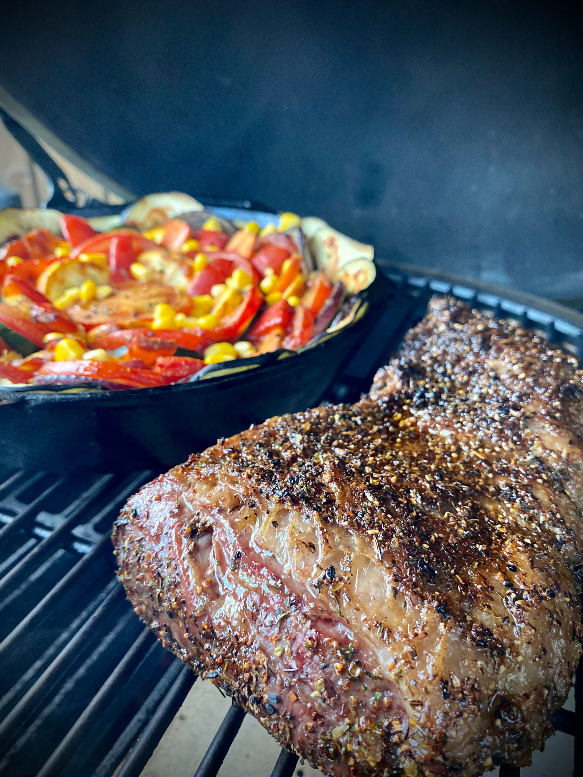 De skillet mag bij een keteltemperatuur van zo’n 200 graden op het grillrooster. Het zal tot rond de 45 minuten duren voordat de groentes gaar zijn. Deze tijd, temperatuur én waarschijnlijk nog ruimte op de barbecue, kun je goed benutten voor bijvoorbeeld een reversesear bavette. Ofwel indirect naast de groenteskillet tot 48 graden Celsius kerntemperatuur en daarna op direct wijze afgrillen.