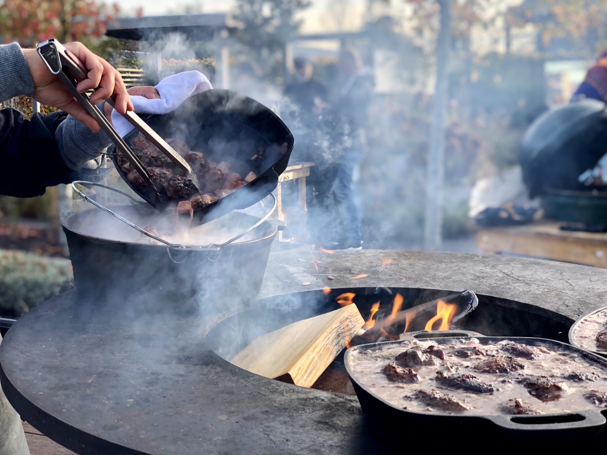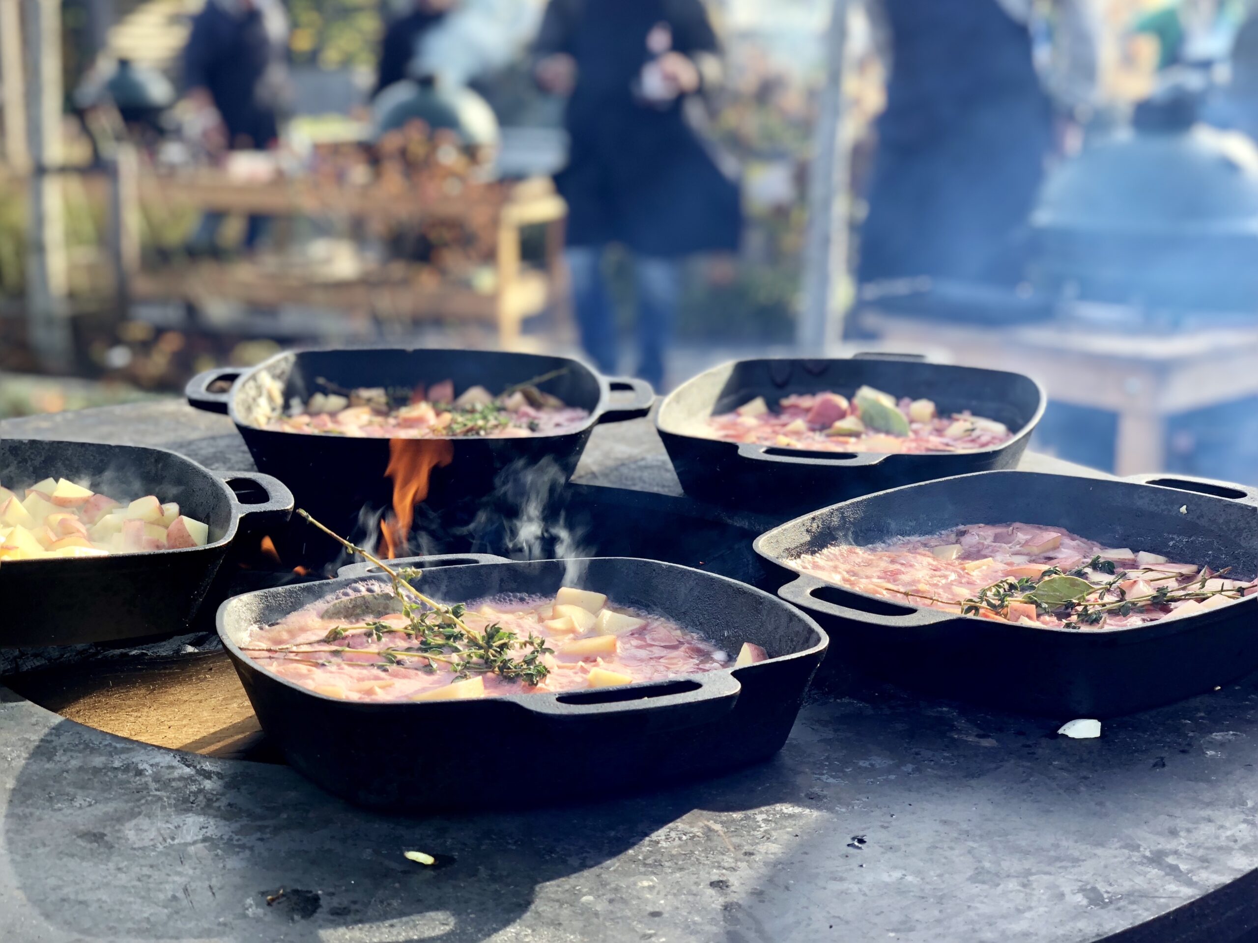 Het recept is goed te maken op een kamado of eigenlijk iedere BBQ. Ook op een vuurschaal zoals de OFYR, een Zuid Afrikaanse Braai of zelfs op een open vuurtje is het goed te doen! In de livestream (video hieronder) doen we het volledig op de kamado. Zoals op de foto’s kunt zien gaat het ook prima op de OFYR. In de fysieke workshop maken we een hoop individuele pannen om de techniek te doen en vervolgens gaat het allemaal in 1 grote dutch oven om langzaam te garen en alle smaken te laten vermengen.