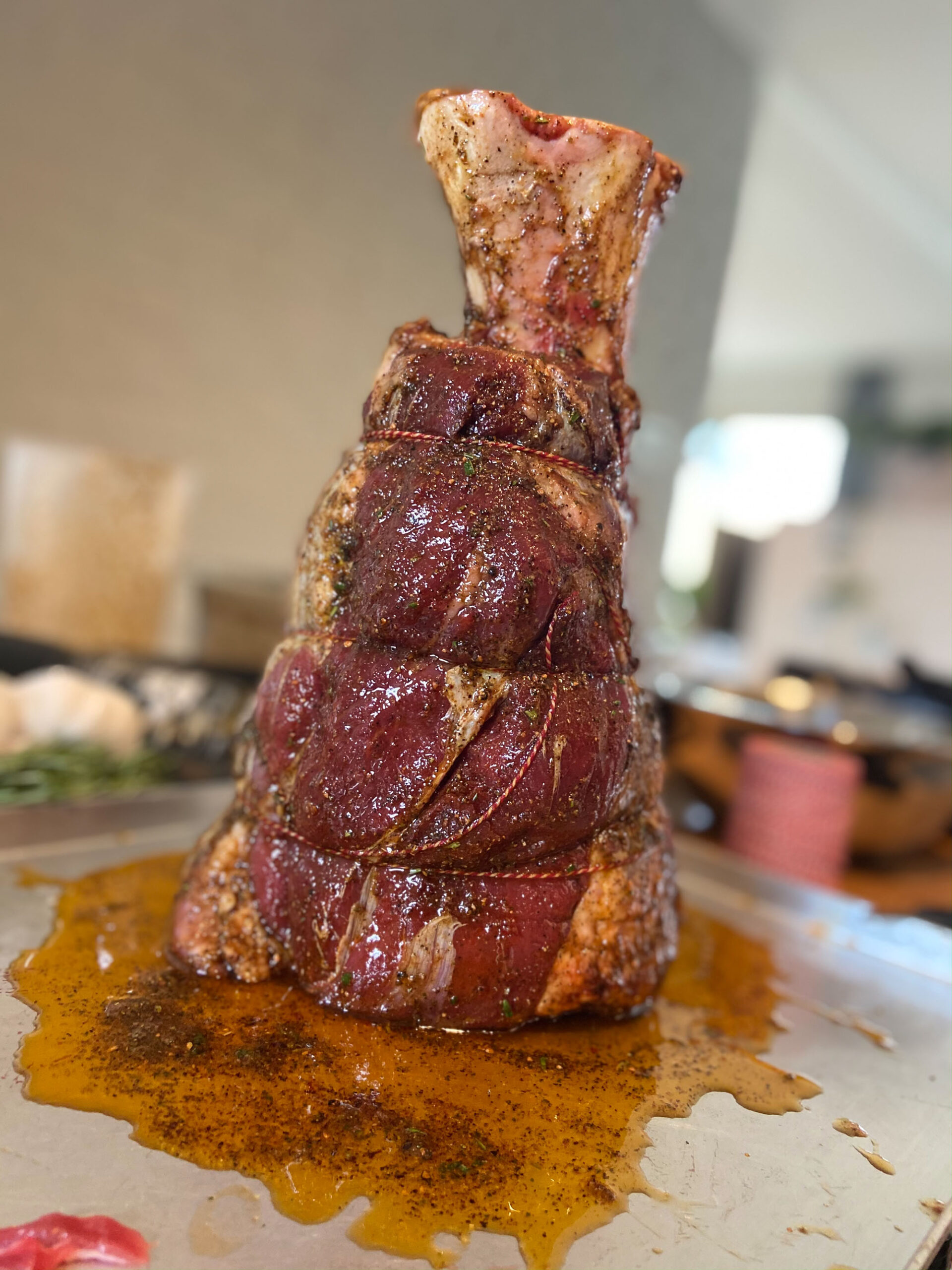 Neem nu het bindtouw en knoop het vlees vast zodat wanneer het vet langzaam gaat smelten deze netjes bij elkaar blijft. Zet een drip pan onder het rvs rooster en zet de beef hammer in de bbq. Maak met alumium een kommetje in de druippan om vet en gesmolten beenmerg op te vangen. Dit is lekker om aan het einde weer te gebruiken.