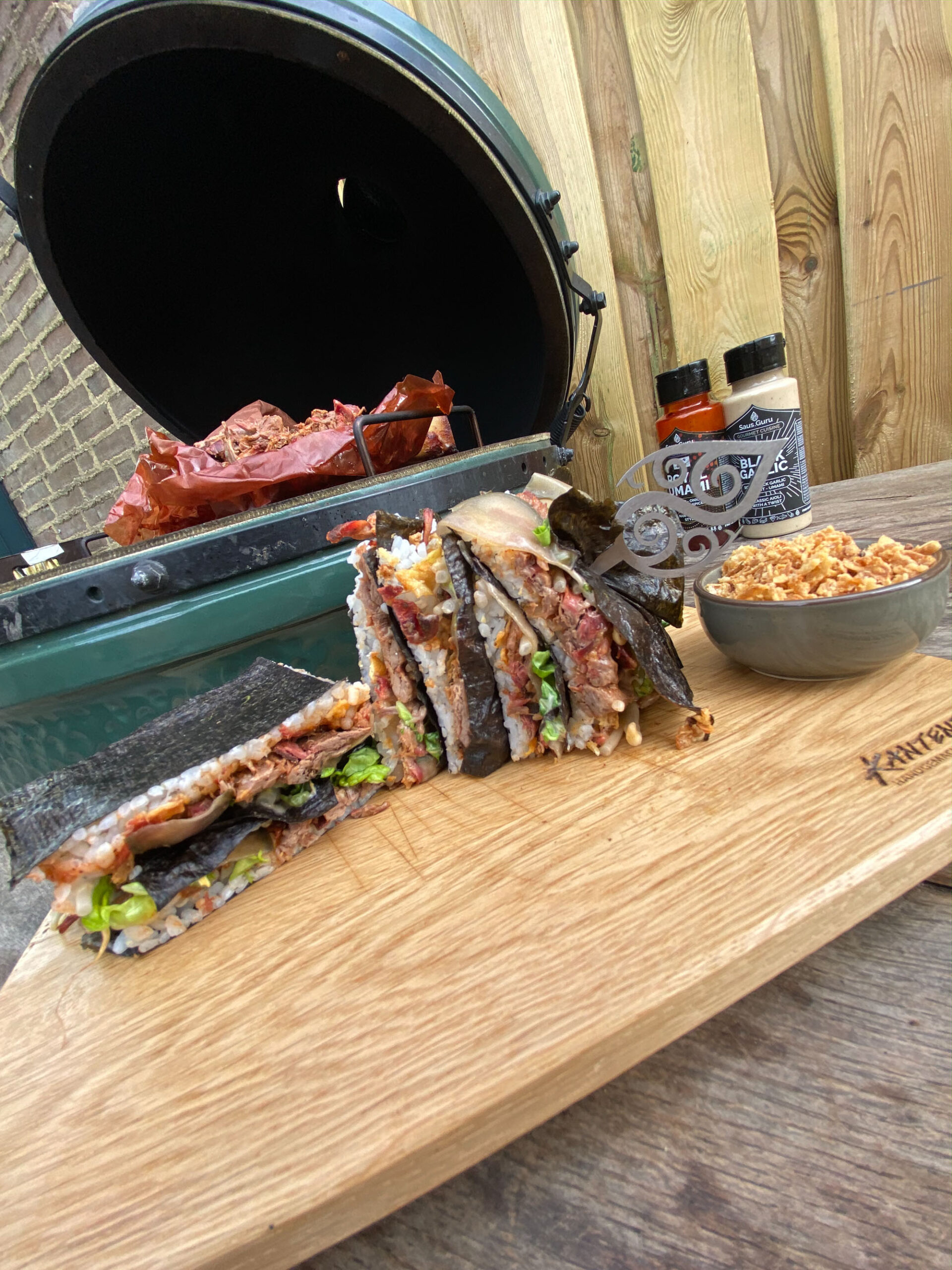 Start met een vel nori en druk hier de sushirijst op. Strooi dan wat gebakken uitjes er overheen, gevolgd door pulled beef. Drizzle nu nog wat black garlic saus over het vlees zodat de zoet zure komkommer uit BBQ-jars erop blijven plakken, snij nu de little gem in fijne reepjes en strooi die er nog over. Leg nu het tweede vel nori erop en druk zachtjes aan. Gebruik een scherp schoon mes om het vel te delen. Je kunt er of vierkantjes of drie hoeken van snijden.