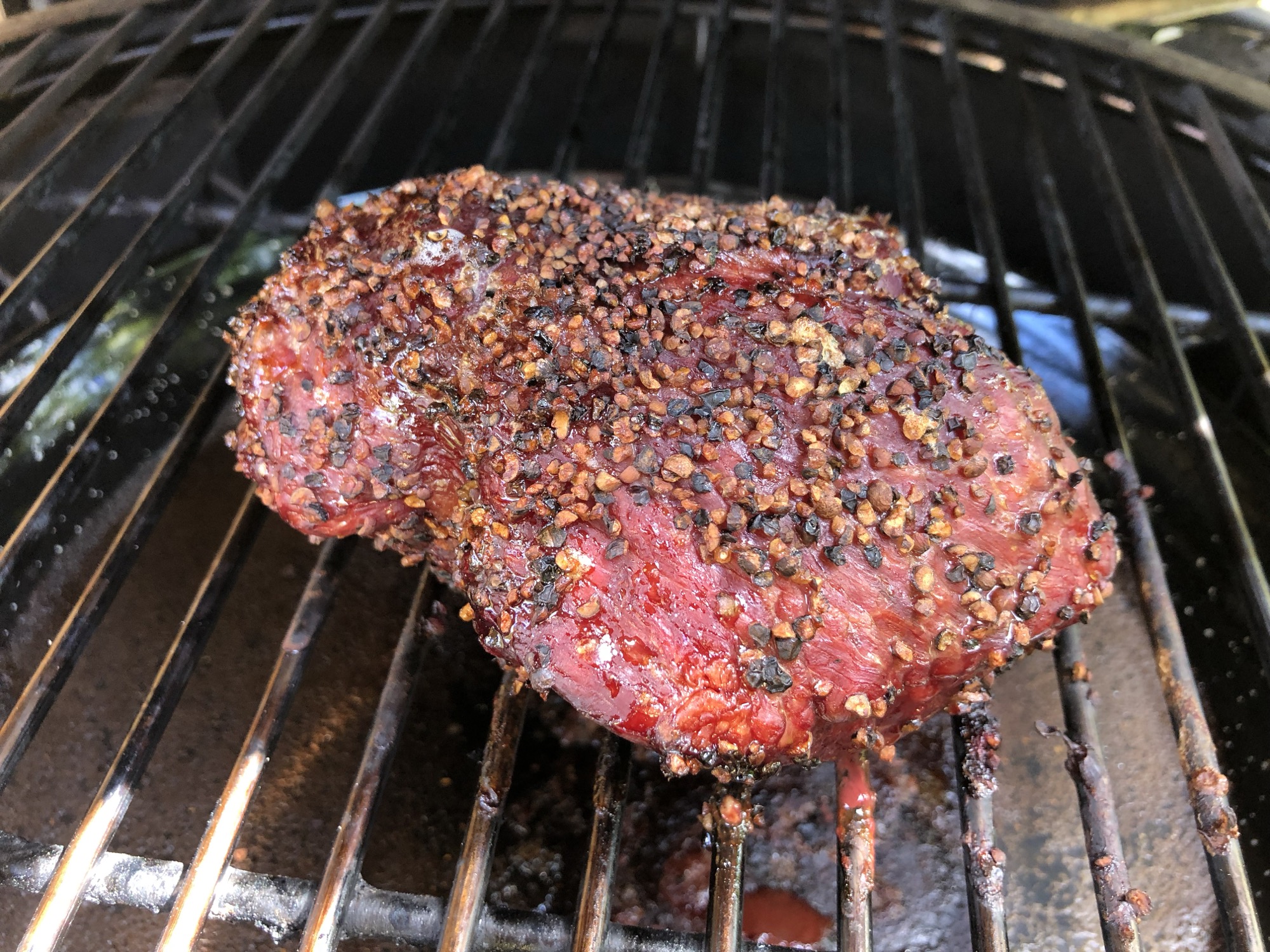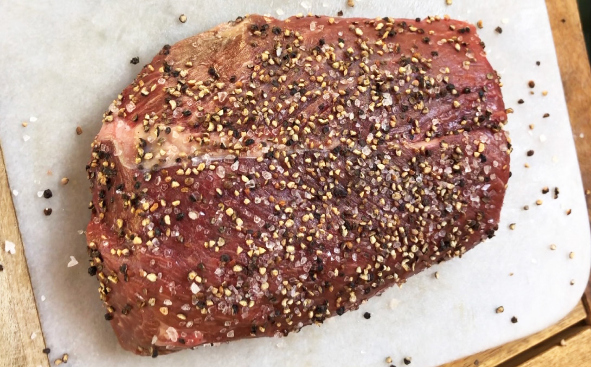 Controleer je vlees. Haal taai vlies (silverskin) weg maar laat vet zitten. Dit vet gaat namelijk lekker smelten en zorgt voor extra smaak en sappigheid in je vlees. Smeer het vlees rondom in met gele mosterd en bestrooi rijkelijk met zwarte peper en grof zout.
