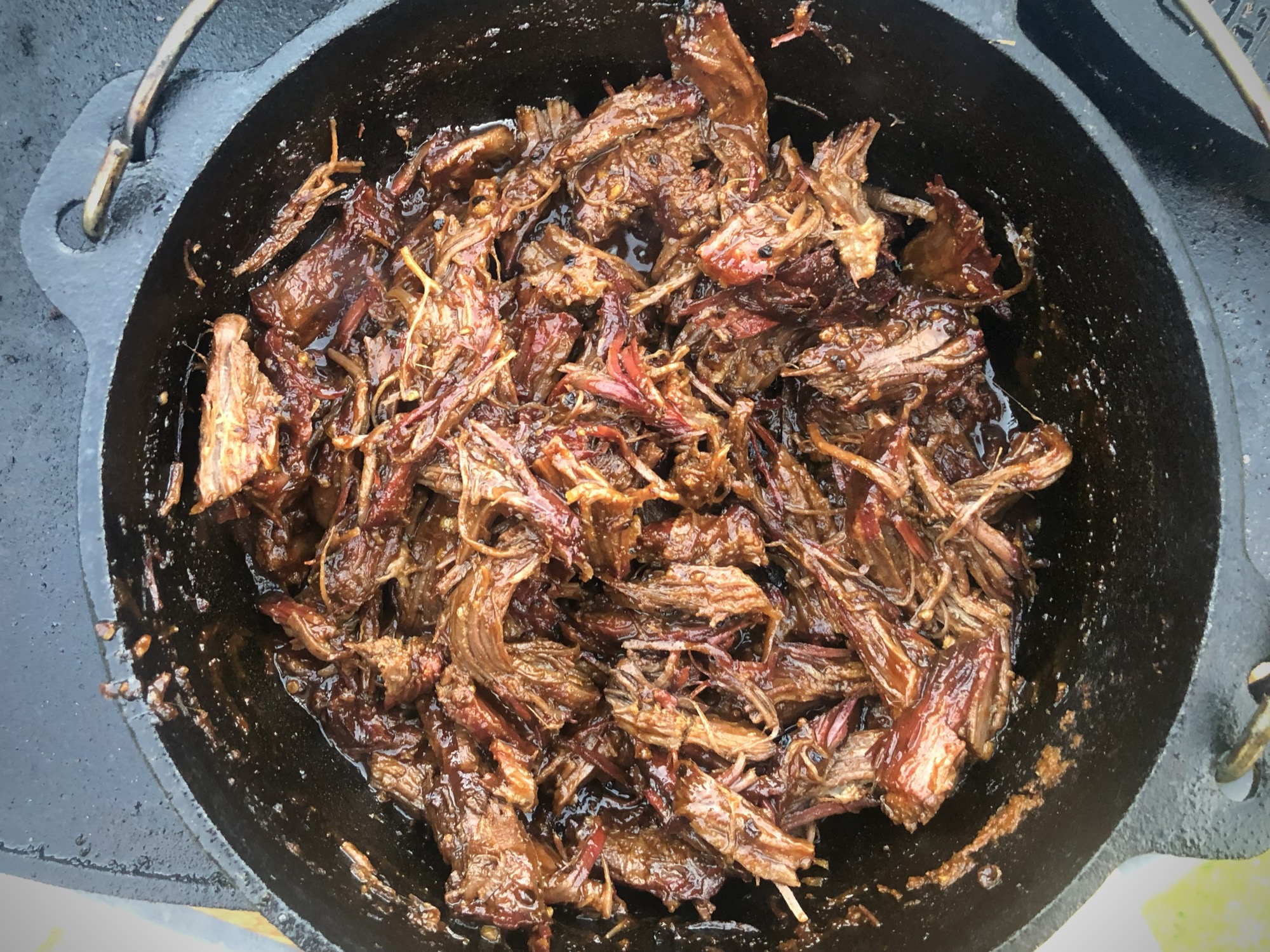 Verwarm ondertussen de rest van het flesje saus in de Dutch Oven. Trek het botermalse en super zachte vlees in mooie stukken met de meat claws. Voeg het vlees toe aan de warme saus in de Dutch Oven, roer goed door en verwarm nog even mee.
