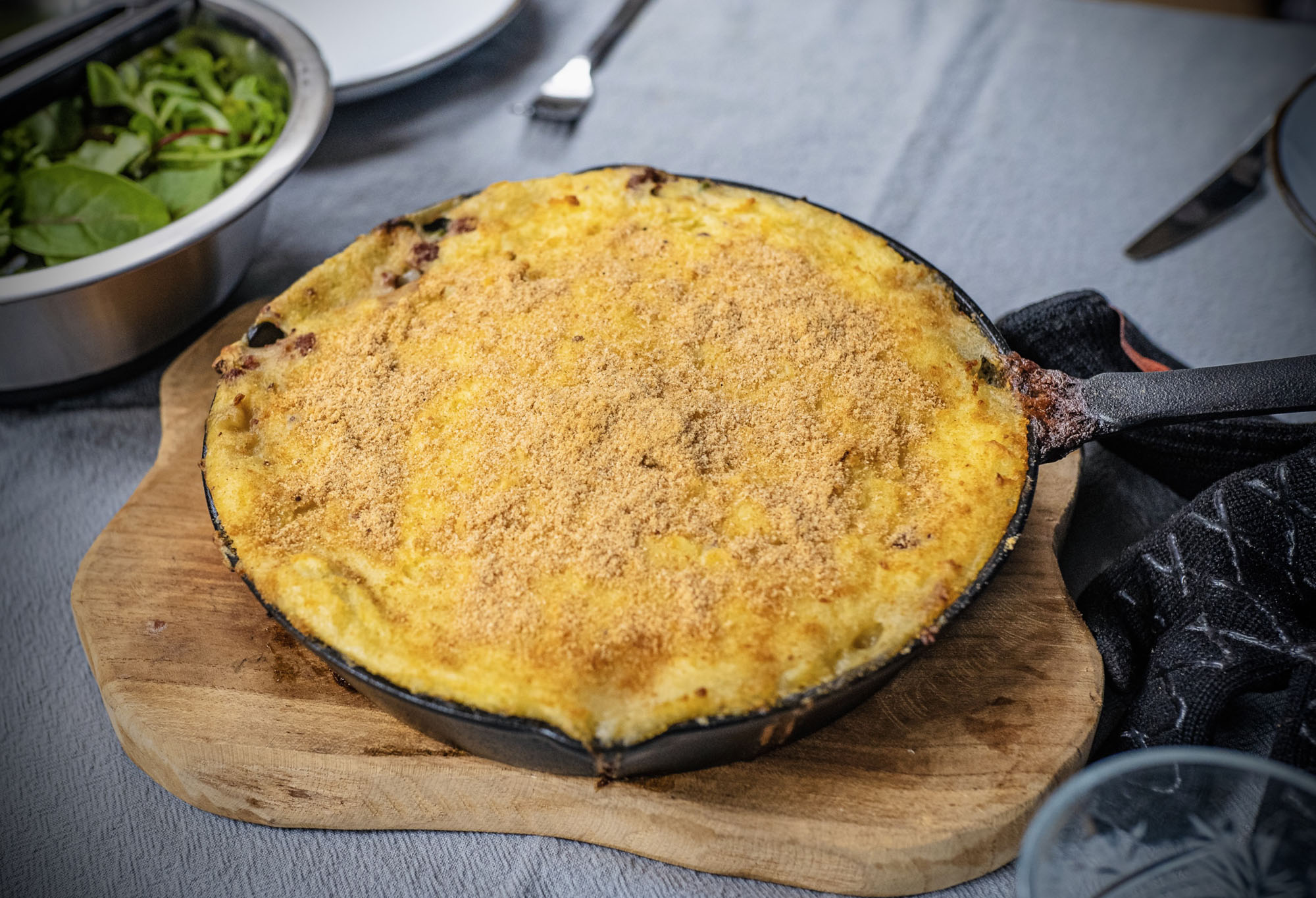 Plaats de skillet op het rvs rooster en bak de shepherds pie mooi gaar en lichtbruin. Na ongeveer 30 minuten bakken kun je de skillet op tafel serveren.