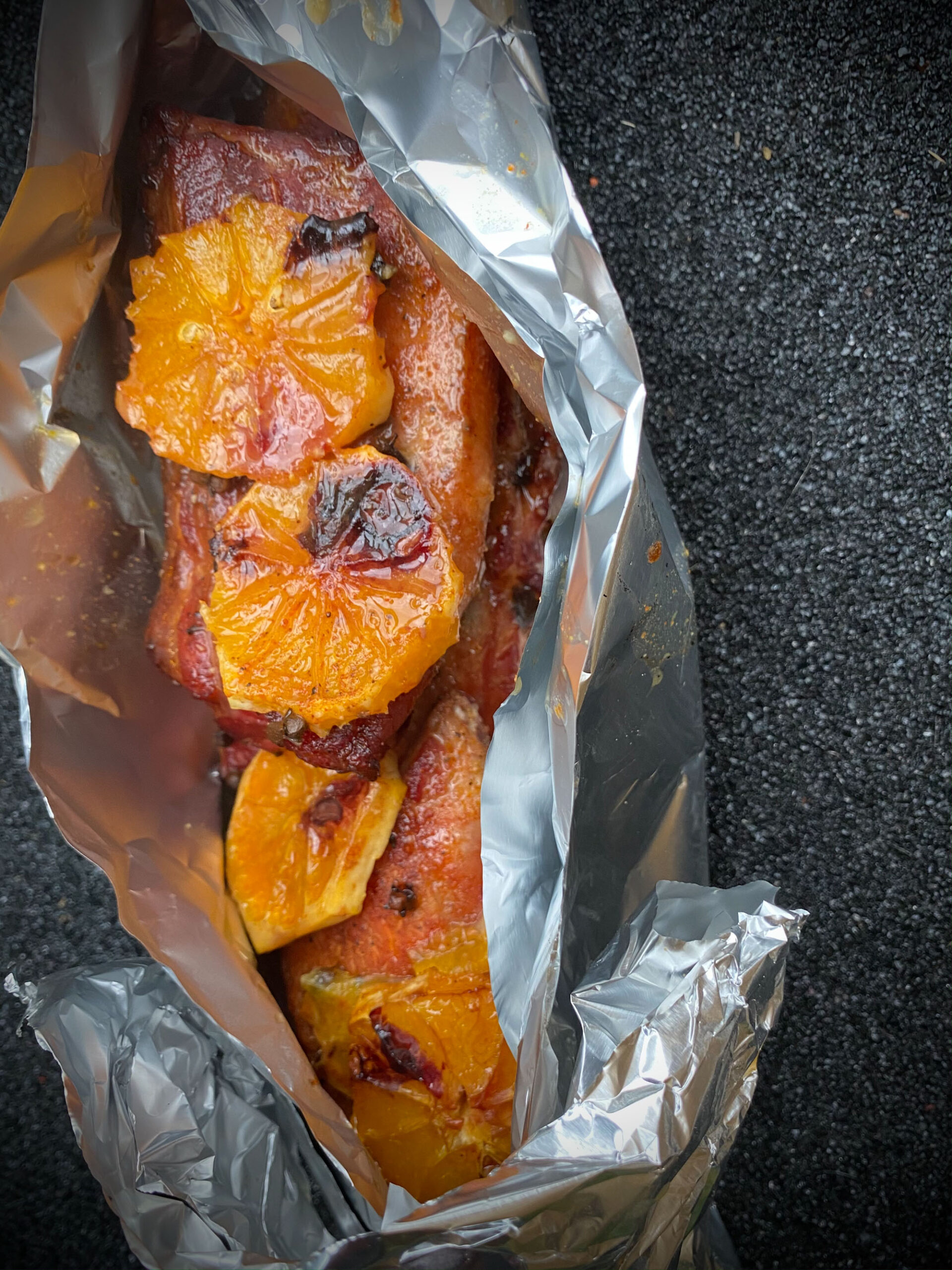 Neem een ruim stuk aluminiumfolie en stapel de vier stukken spareribs hier in op. Haal de druippan(nen) van de platesetter af en verdeel de sinaasappel over en naast het vlees. Vouw het folie aan de onderkant en zijkanten dicht zodat het niet kan lekken en voeg een beetje vocht uit de druippan(nen) toe. Vouw het pakketje hierna helemaal dicht. Deze gaat voor minstens een uur terug op de kamado.