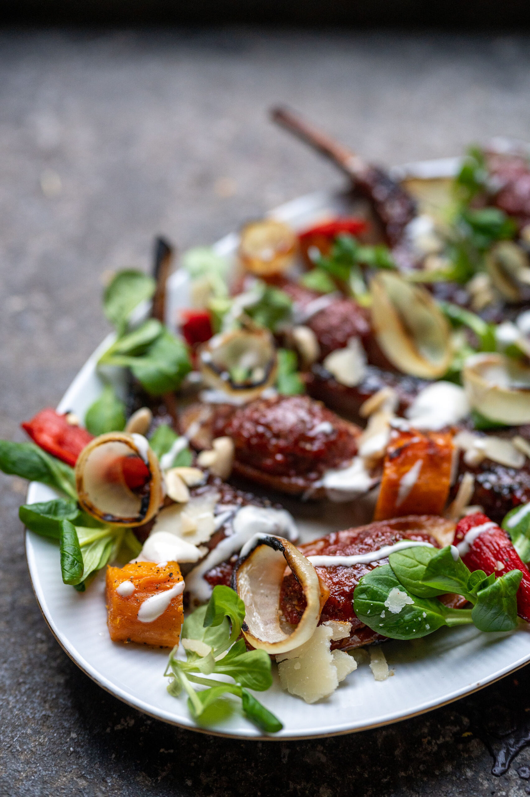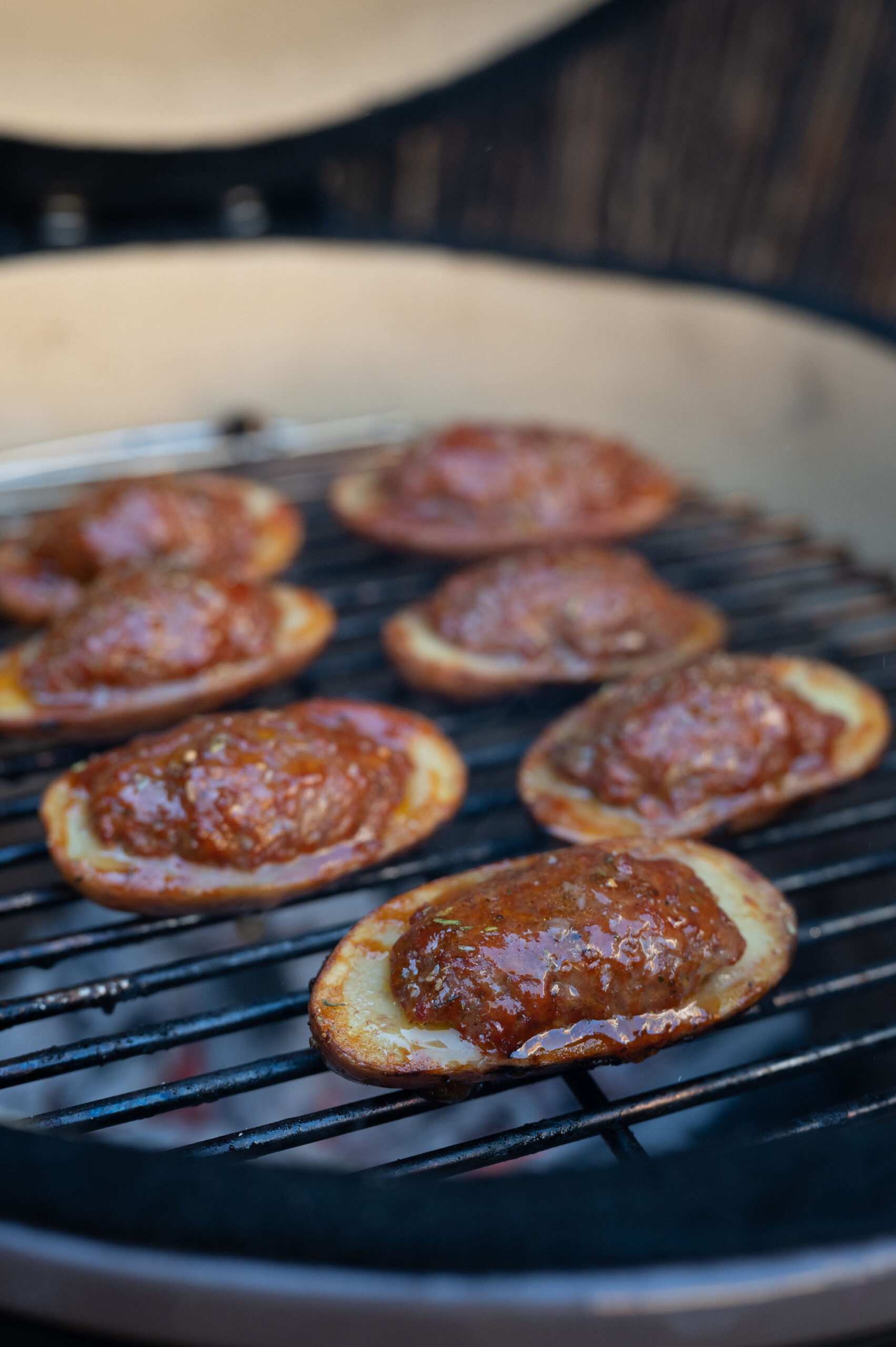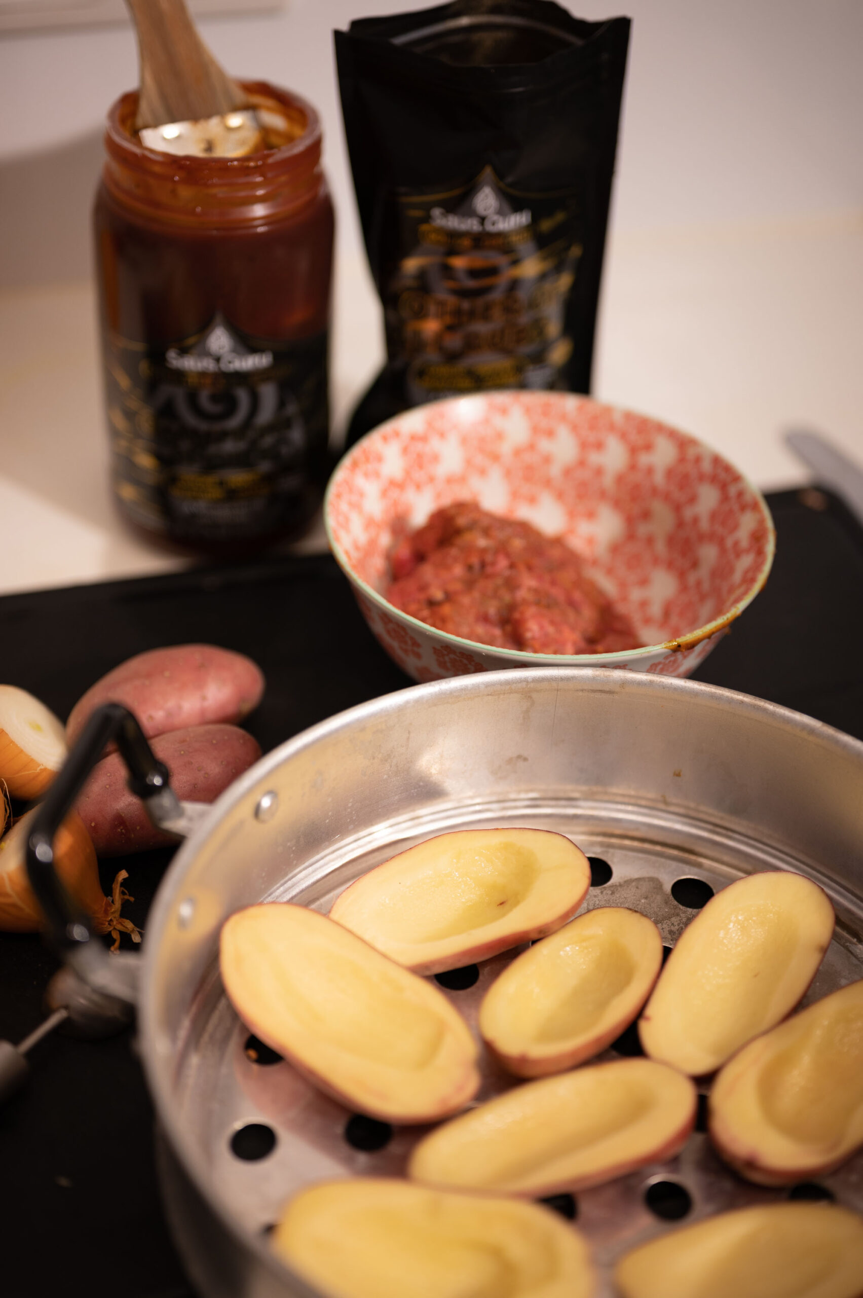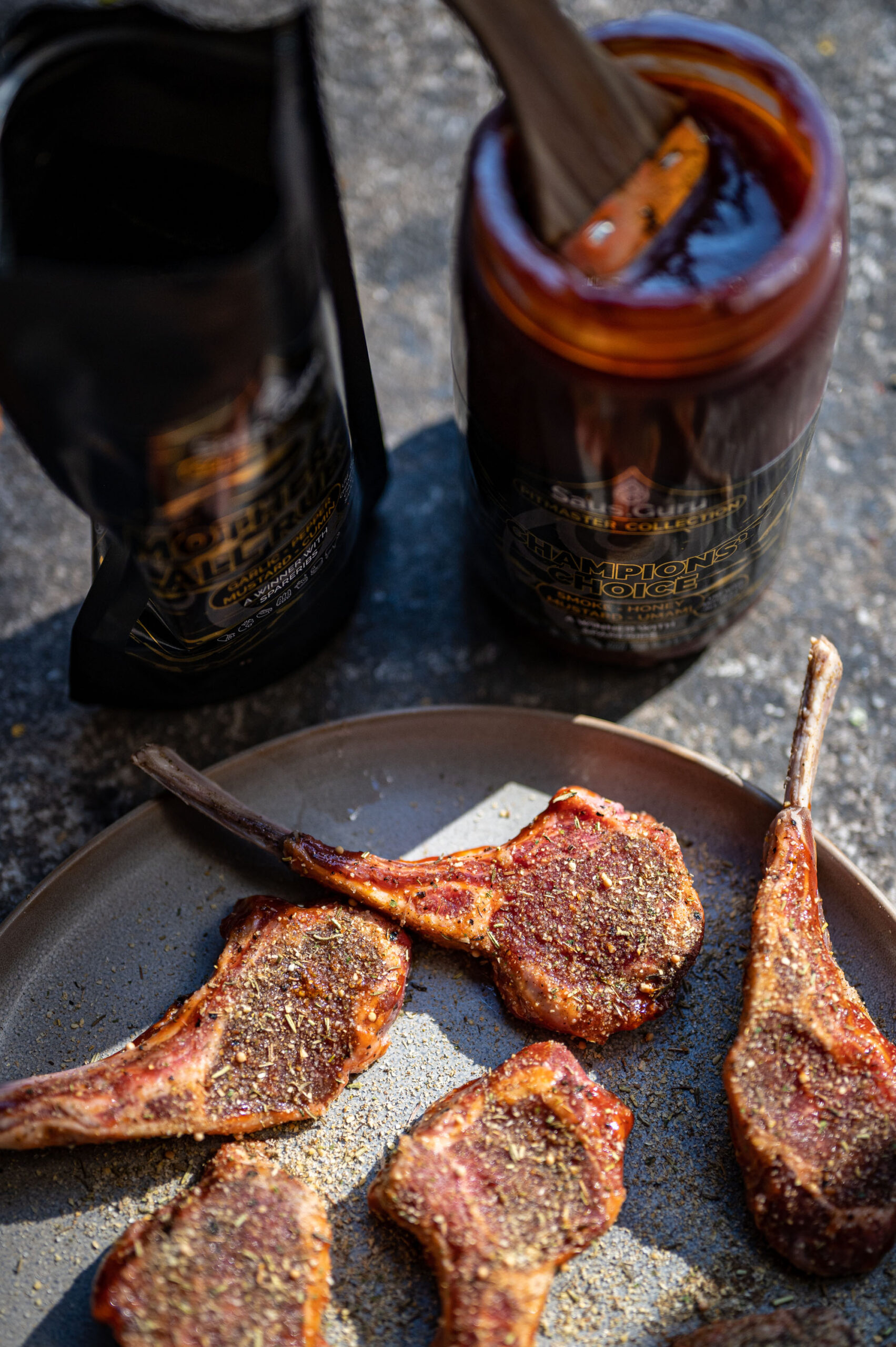 Voor het Sticky lamskoteletjes recept heeft u de volgende ingrediënten nodig: 1 lamsrack, 6 Roseval aardappels, 600 gr lamsgehakt, 2 tl Mother of all rubs en Champions Choice saus.