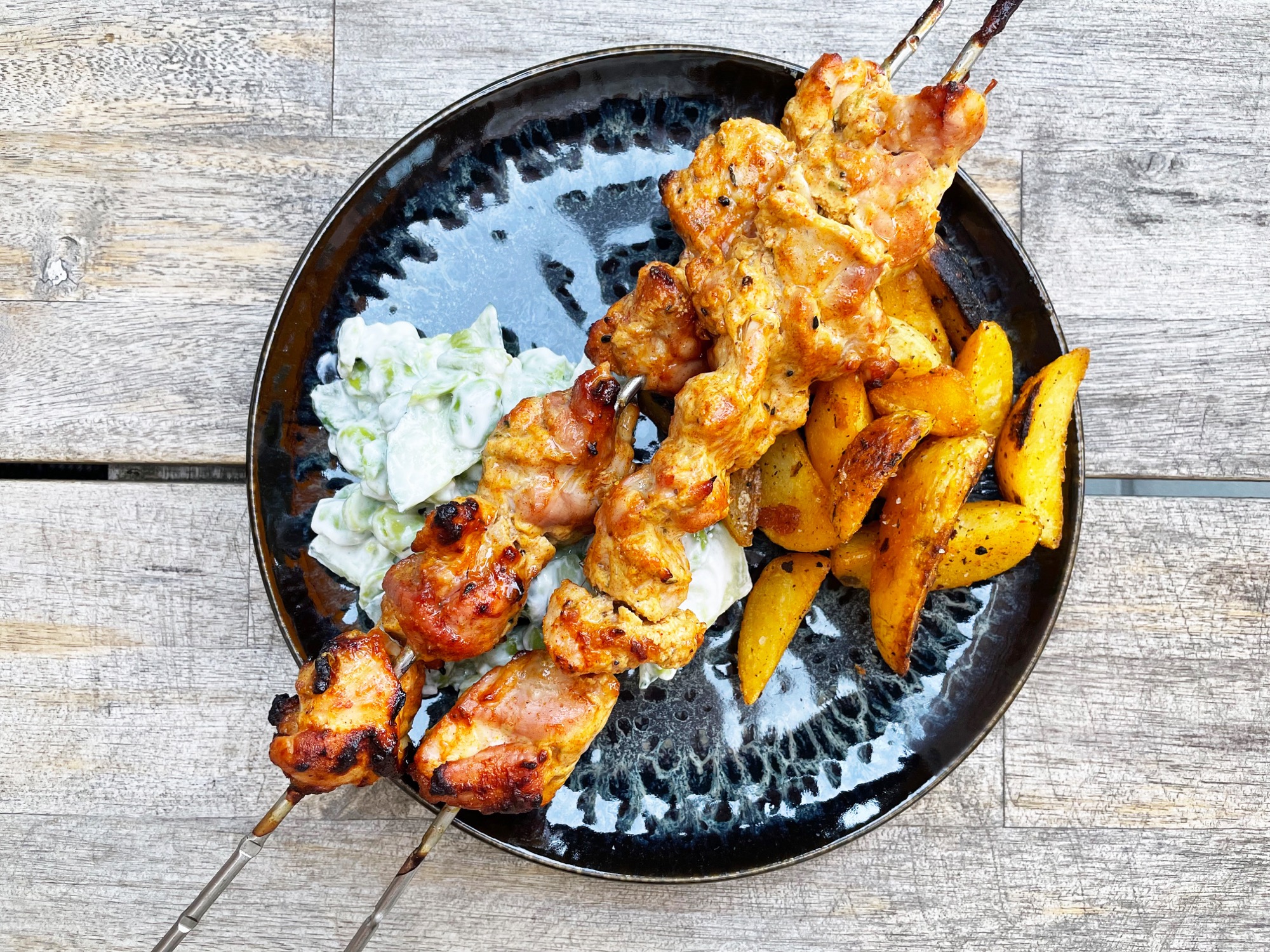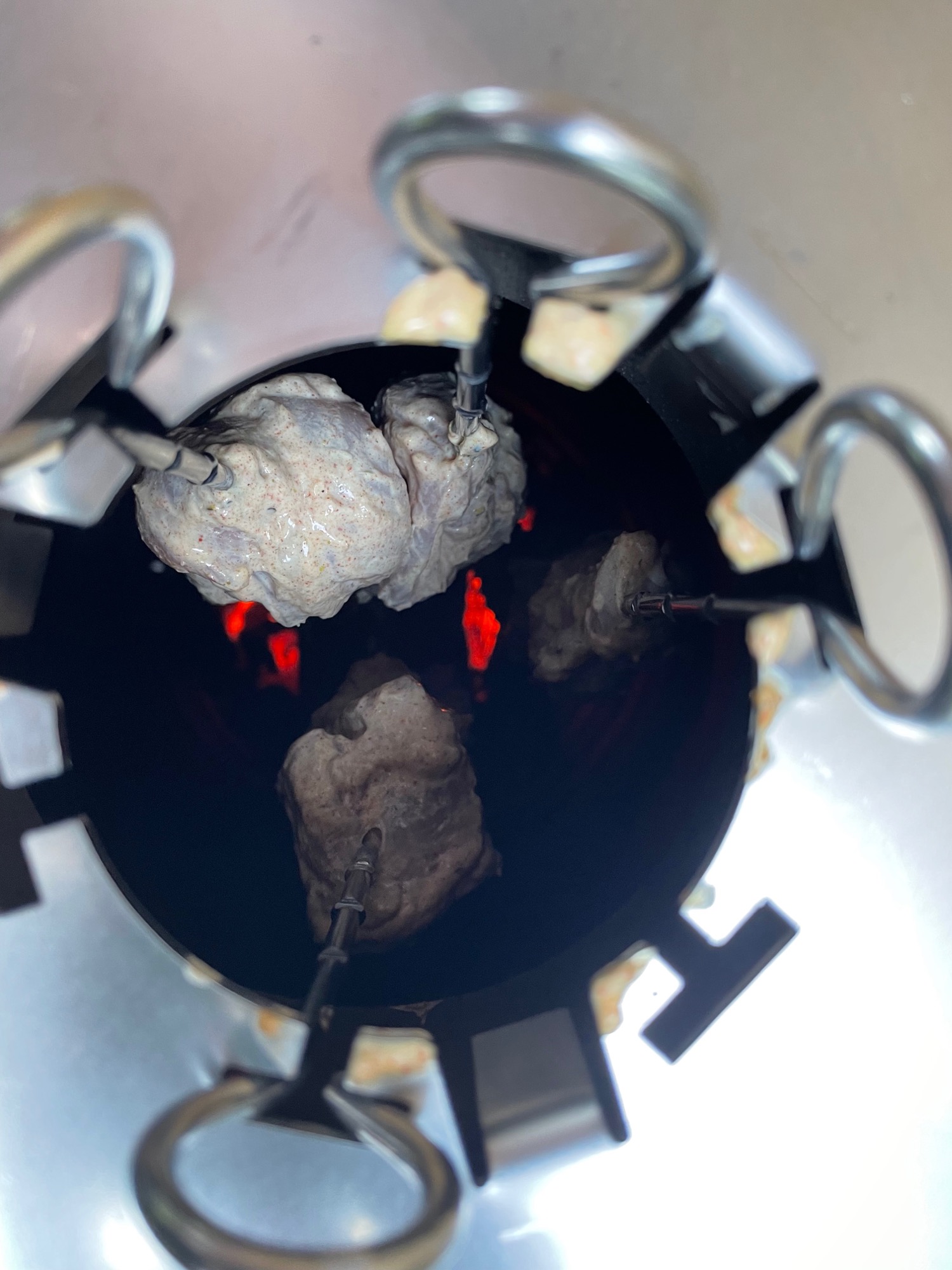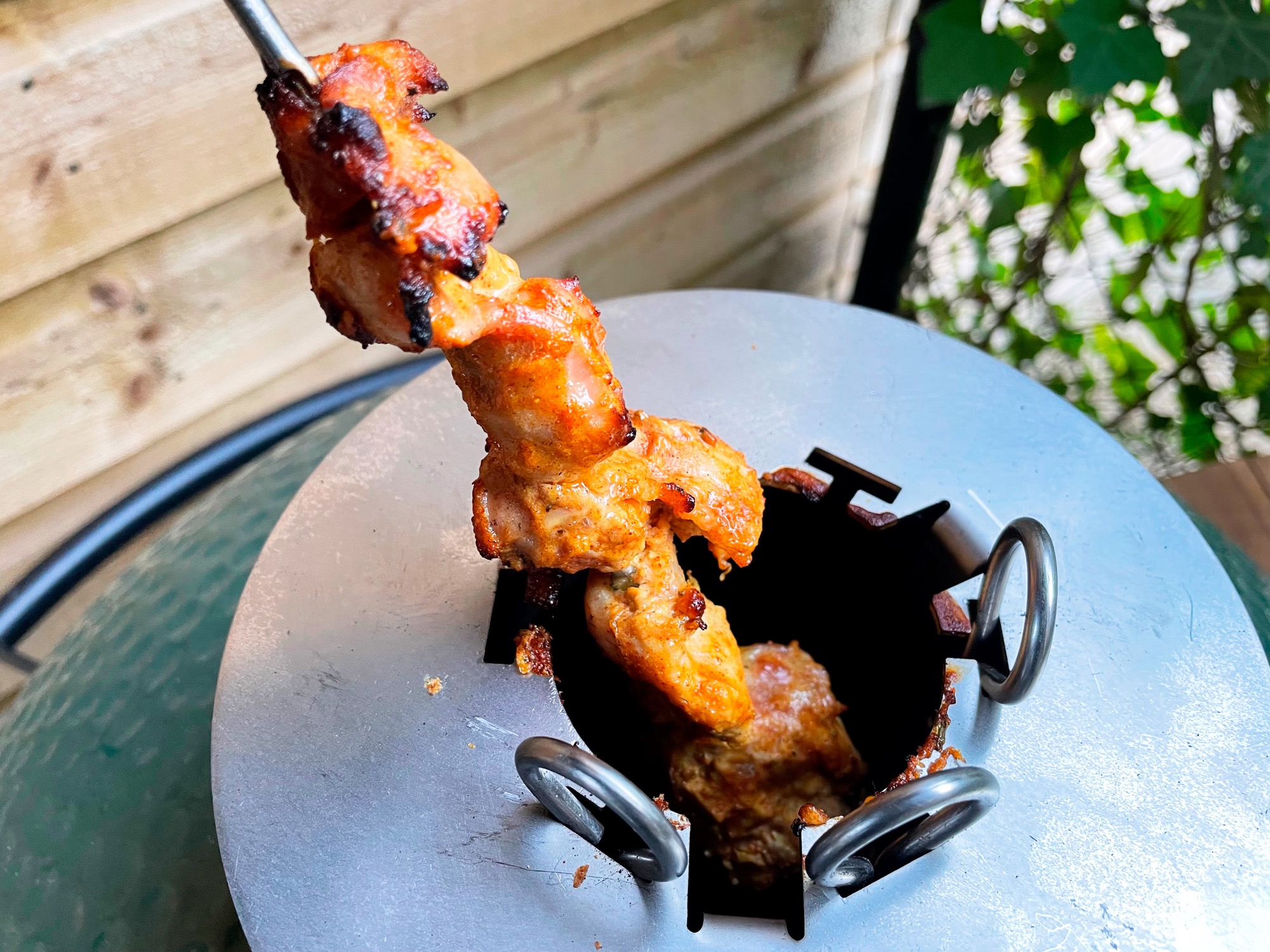 Verwijder de top vent van je kamado en plaats de tandoor ring. Hang de spiesen met de gemarineerde kip in de ring en laat zo’n 25-30 minuten garen of tot de kip goudbruin is en een kerntemperatuur van minimaal 72 oC heeft behaald. Controleer tussendoor af en toe of de garing gelijkmatig gaat en de kip niet verbrand, je bent direct boven het vuur aan het garen, het kan opeens snel gaan. Gebruik bij het ophalen van de spiesen altijd een vuurvaste handschoen. De spiesen worden namelijk onwijs heet; don’t burn your fingers!
