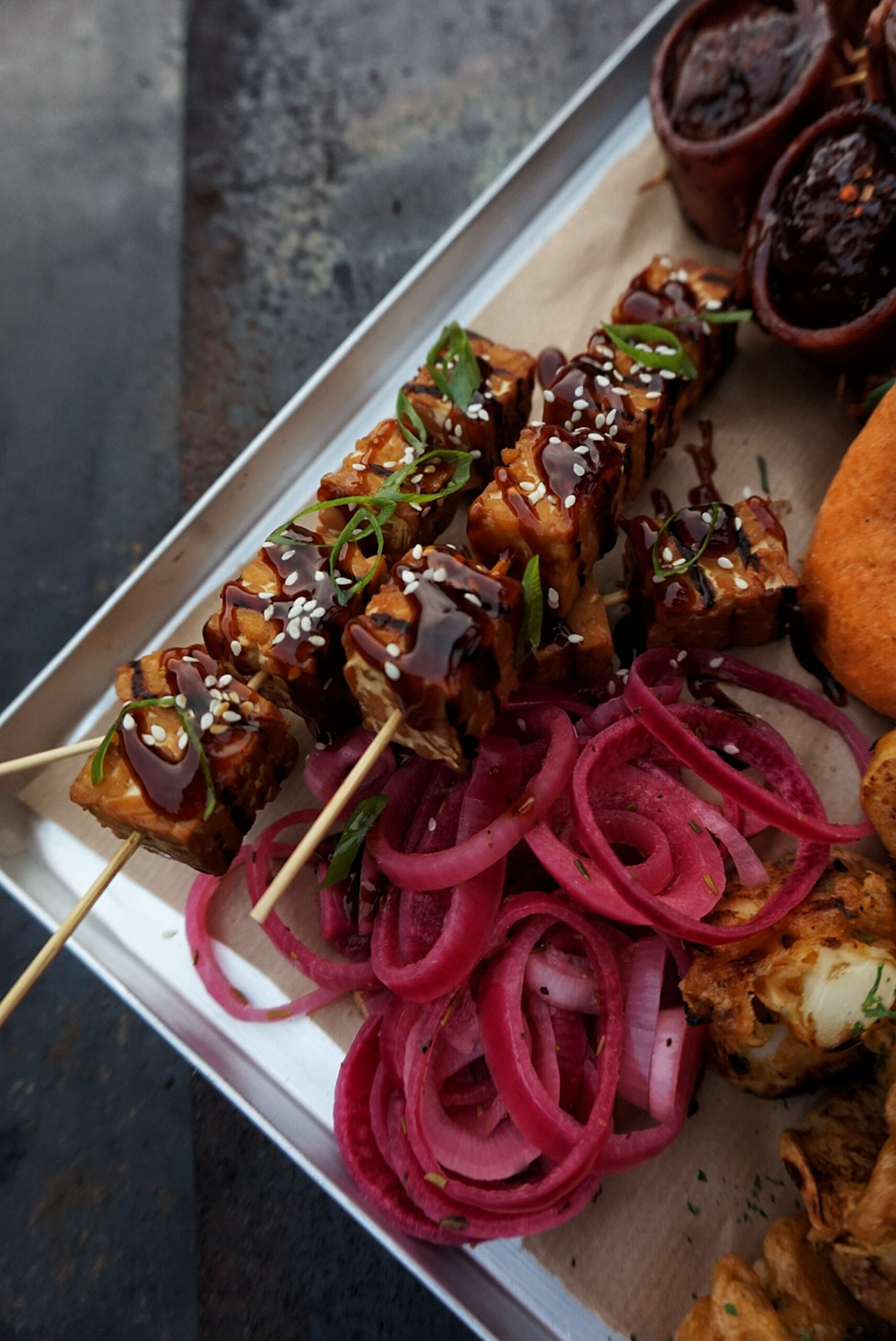 Voor de marinade, voeg de soya, sesam olie en rijst azijn in een pan en verhit samen tot net aan de kook leg daarna de tempeh blokjes erin. Laat de marinade afkoelen in de koelkast met de blokjes erin. Rijg de blokjes aan een spies, de marinade kun je verder inkoken tot een saus die je weer over de spiesjes kunt draperen. Strooi er nog wat witte sesam overheen voor de smaak en oog effect.