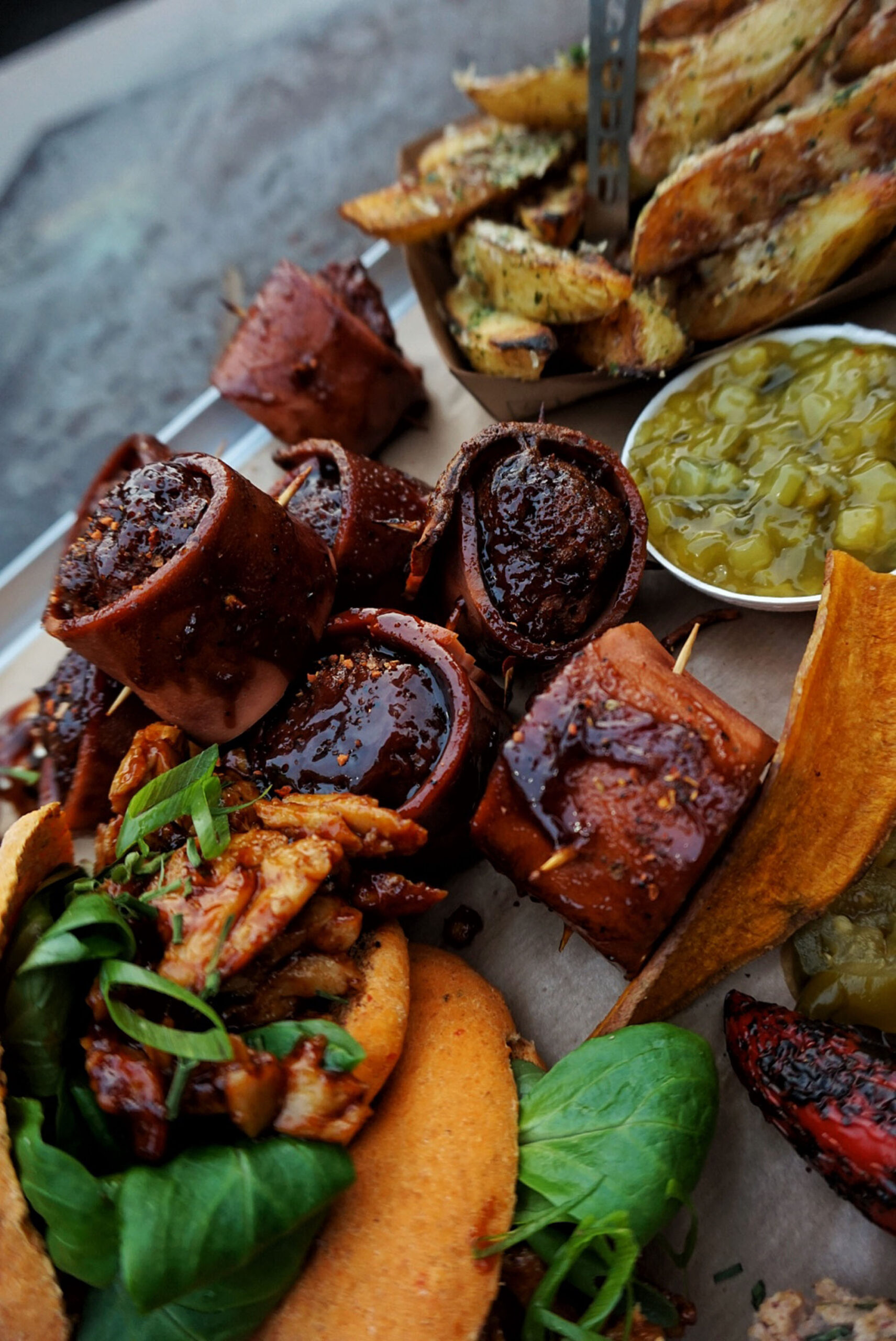 Meng door het vegan gehakt de beef bark rub. Rol nu balletjes van het mengsel. Lak de balletjes nu met Black Mojo saus wikkel dan de ballen in met een plak vegan bacon en steek er twee cocktailprikkers doorheen. Wanneer je een grill opzetstuk voor je ofyr hebt geur en kleur ze eerst daar wat op. Daarna kun je ze op de bakplaat verder warm maken. Lak ze nu nog een keer in het geheel af met black mojo saus.